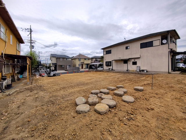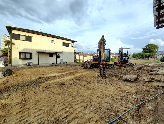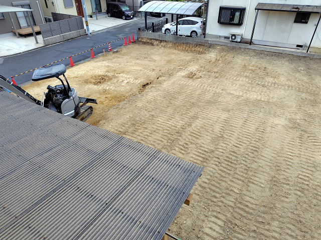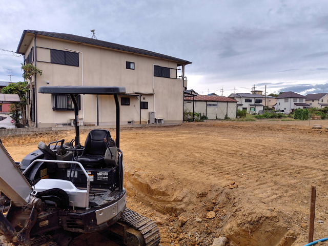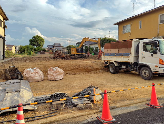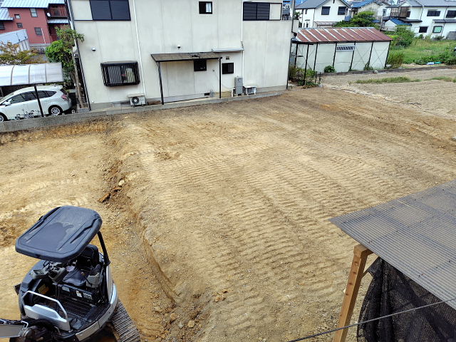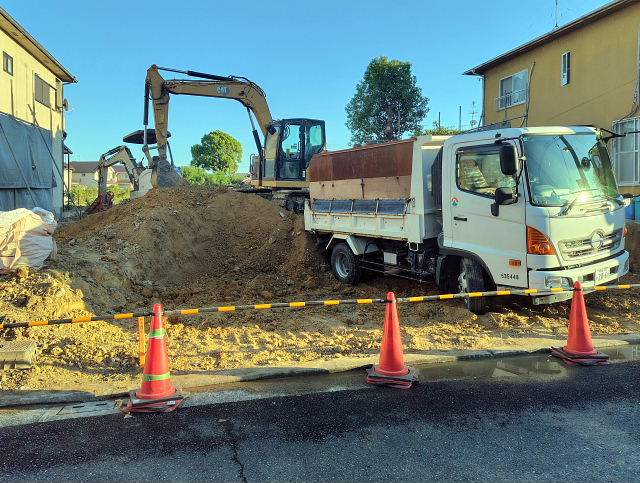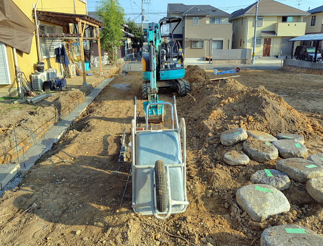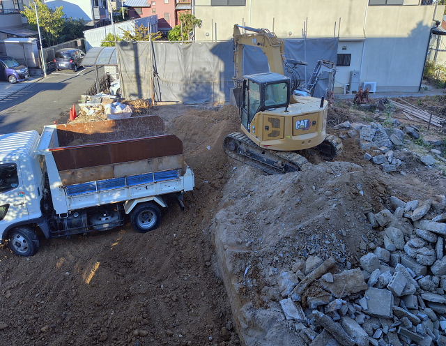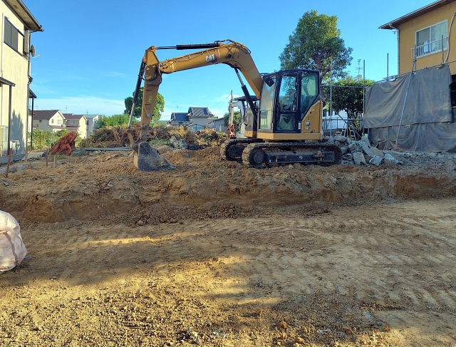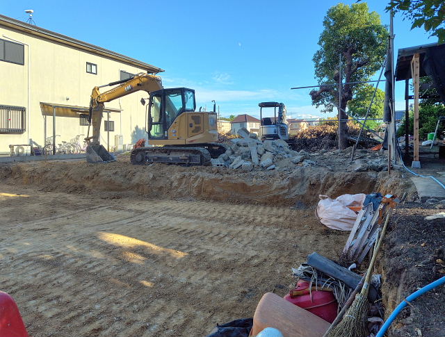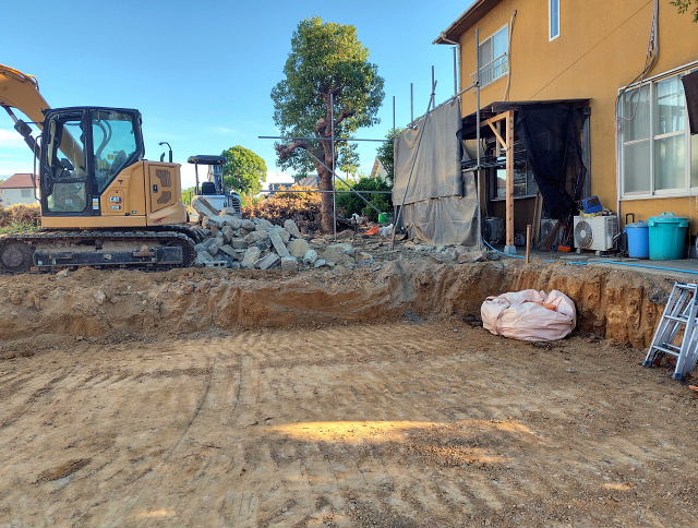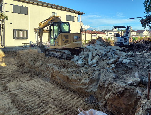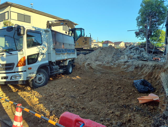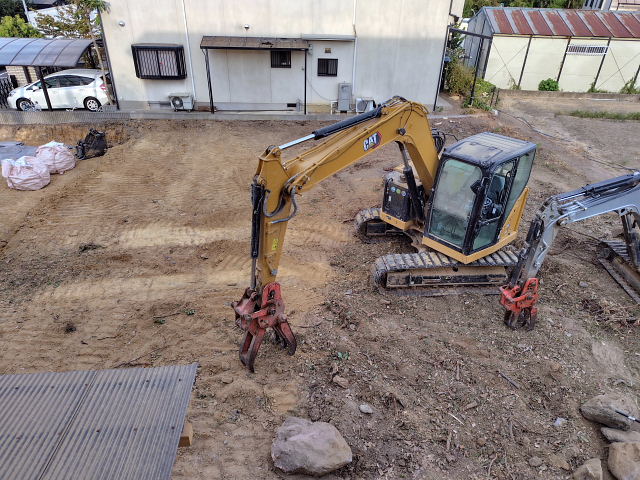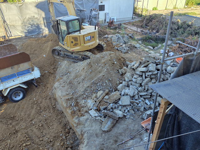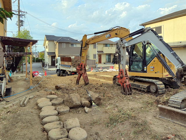 今日の工事は境界のコンクリート外し、家屋跡の整地。切り倒した樹木の撤去は明日以降になりそう。