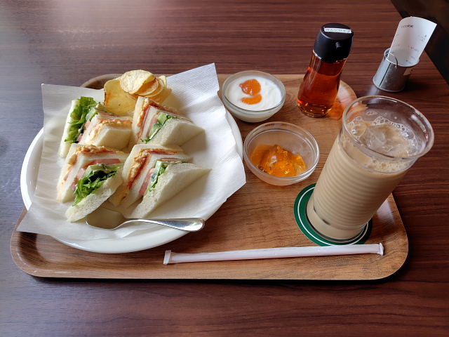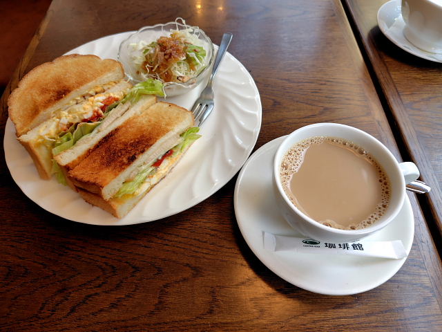 となると京橋辺りで新しいカフェ探し。ただ都会は意外と朝早くから開いてる所が少ない。1軒だけ昔風のを見つけたけど……ナンか気が乗らんなあ。じゃあもっと市内の心斎橋辺りはどうかと探してると心斎橋筋一つはが市側の筋に珈琲館心斎橋店 があった。チェーン店だがどこも落ちついた雰囲気がある。8時開店に合わせて家を出た。中心部でも繁華街を一筋外れると静か、すぐ横に洒落たホテルが建っていた。土日はモーニングメニューはないのでハウスサンドとカフェオーレ。ここも外人さんが多そうだ。角の席から外の景色を見ながら落ち着ける。サンドの味はイイしボリュームもある。大阪に住んでるのにど真ん中の心斎橋、本町周辺のカフェには馴染みがない。これからは(余生は)中心部の純喫茶探訪なんていう道楽を増やすのもイイなあ。