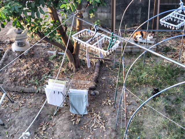 猫たちは外生活にも徐々に慣れヒンヤリした朝は二匹とも外で和んでいる。この辺りに猫の遊び場を造るのもイイかな。工事2週間経過。今日は積まれていた大岩、樹木の撤去。クスノキ伐採、小谷さん境界のカイヅカ根っ子の除去。これでブロック工事に入る訳だな。この家に来た時(約70年前)から生えていたクスノキだが重機を使うとすぐに倒れていった。家がなくなるのはあんまり気にならないけど大きな木がなくなるのは寂しい。今年は妻が死んでいくのと、隣の家・植木がなくなっていくのを経験した。どちらも新しく再生していくんだから良いことと思うべきなんだろう。