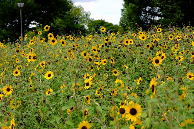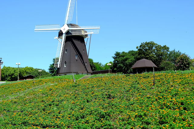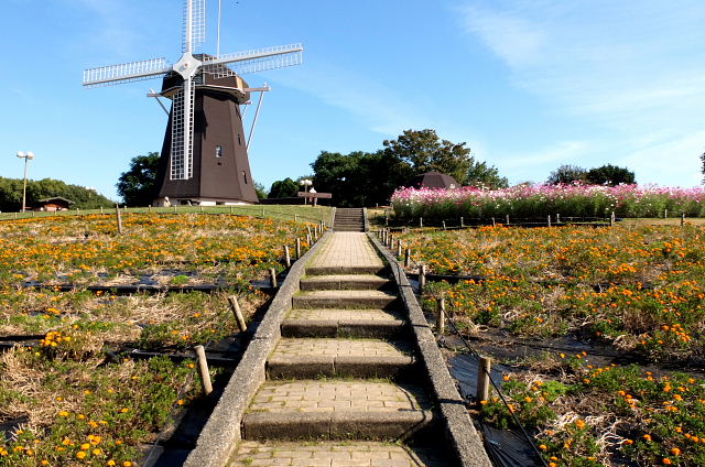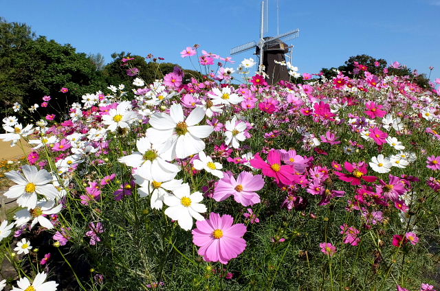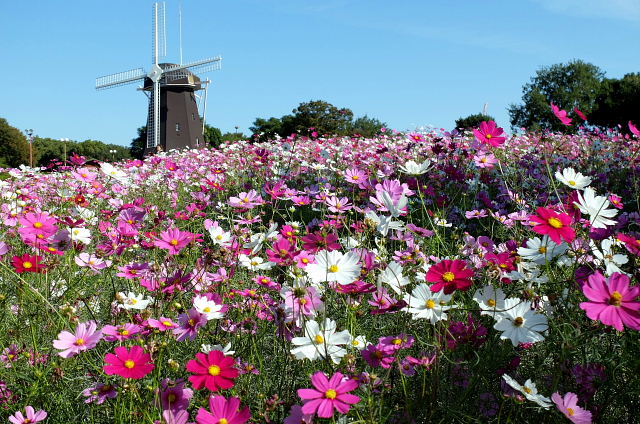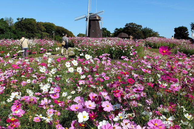 平日朝の鶴見緑地は空いている。風車の丘に上がると満開のコスモス、ただ全部の畑じゃなく半分だけで他は黄色い花が植えられていた。前は全部コスモスだったのに何故こんな中途半端なのにしたんだろう。今時の秀才ちゃんが、切れ目なく花を咲かせようと考え出したのかもしれんなあ。満開、一休み、また満開、休憩のくり返しで良いのに。