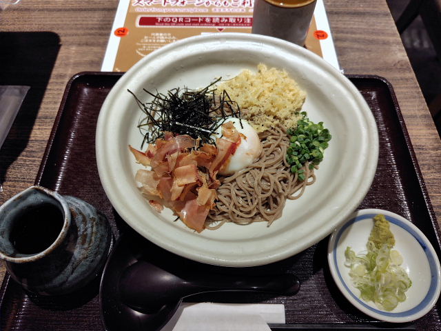 さてこれからが今日の本題ウォーキングシューズ探し。梅田に出て石井スポーツ、モンベル、好日山荘と探してみたけどイイのがない。スポーツ店に置いてあるのはハイキング、トレイルランニングなんてのばかりで街歩き用の感じじゃない。昔のエコウォーカーみたいなのが欲しいんだが今はエコも造っていない。少し履いただけじゃ良し悪しの判断も出来ないんだから靴選びは本当に難しい。難波に戻りモンベルで少しマシそうなのを見つけたが合うサイズがなく取り寄せになるとのこと。買うか買わんかは履いてみないと決められない。サラダだけだと小腹が空いてくる。なんばシティの そじ坊 で冷製月見ソバ。まえにあった梅味の冷製ソバはメニューから消えていた。昔の方が色んなのがあったのに段々均一化していく。