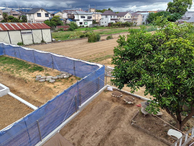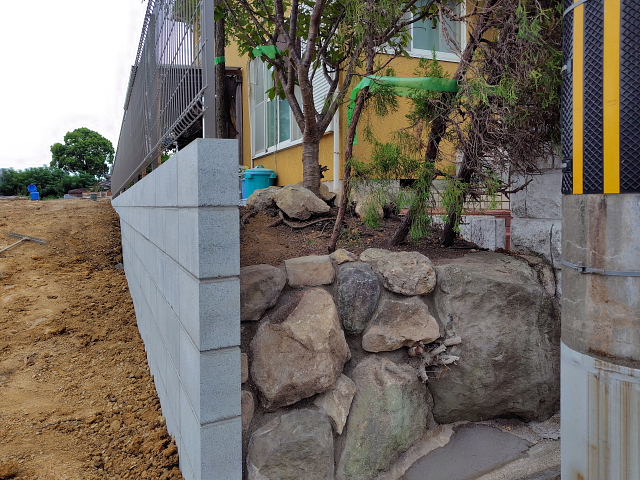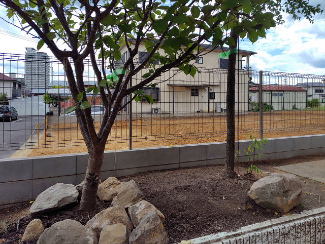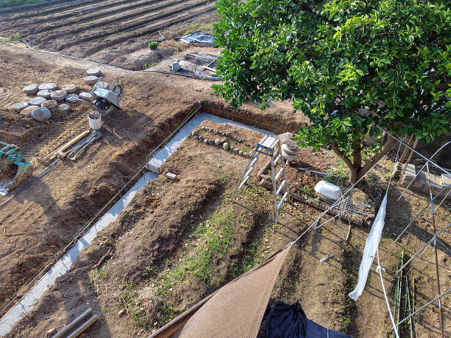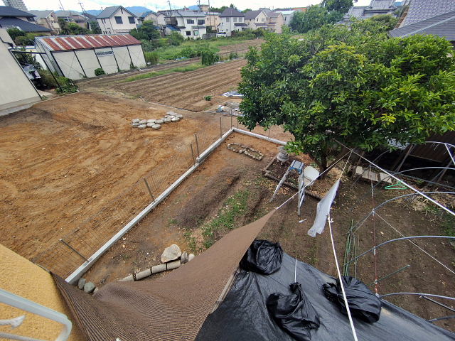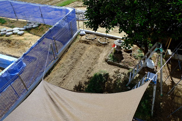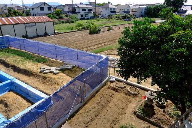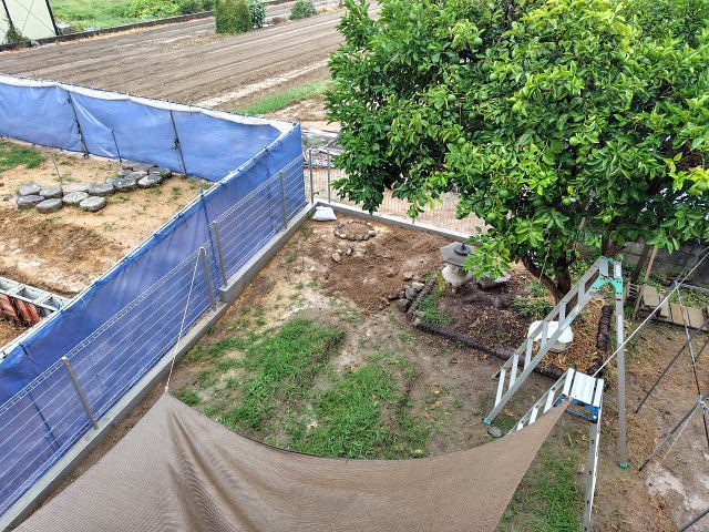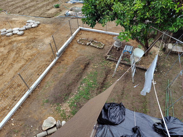 境界ブロック・フェンス工事は一応終了していた。上から見た感じはスッキリしすぎたような。畑をやるなら前よりもユッタリ畝を作れるし陽当たりも良い。旅行から帰ったらマジに野良仕事しよう。