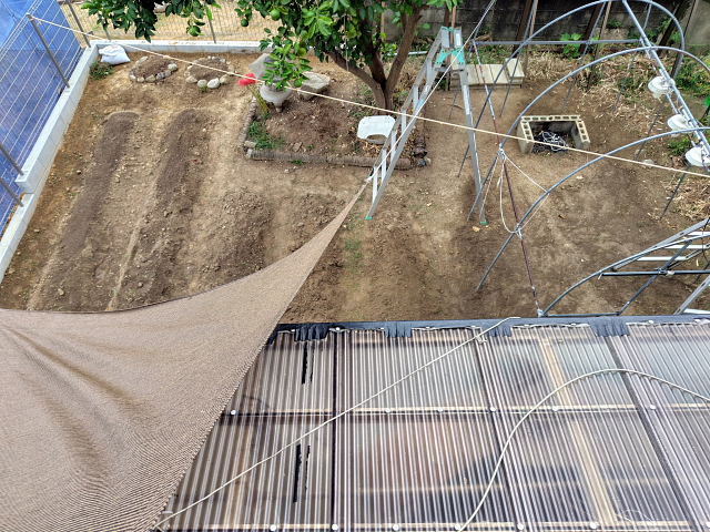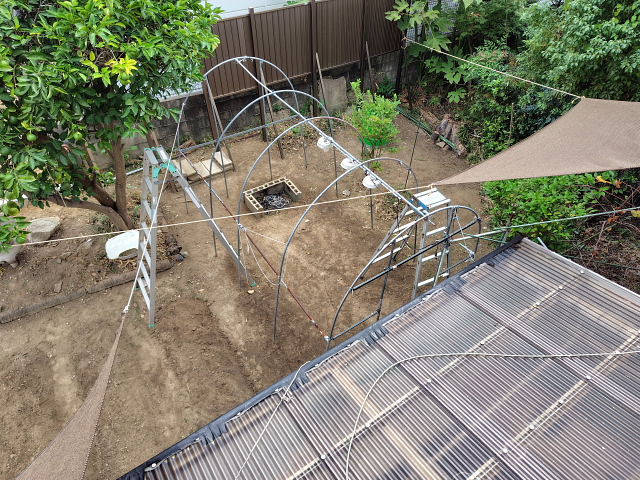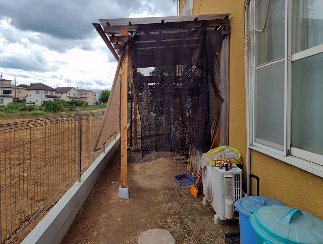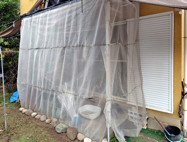 今日は午前中晴とのことだったので、洗濯干し場に目隠しのターフを付けた。引っかける所が柔いので強風が吹くと外れるだろう。その時に考えたらイイ。ベランダの雨除けにビニールシートを貼った。高さ1.8mで下まで届かないが少しの雨くらいは大丈夫だろう。以前はターフを掛ける所が木しかなかったので中々決まらんかったけどフェンスだと自由に掛けられるので見た目はスッキリ。新しい敷地になったんだ、それに合うように変えていくしかない。