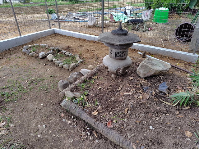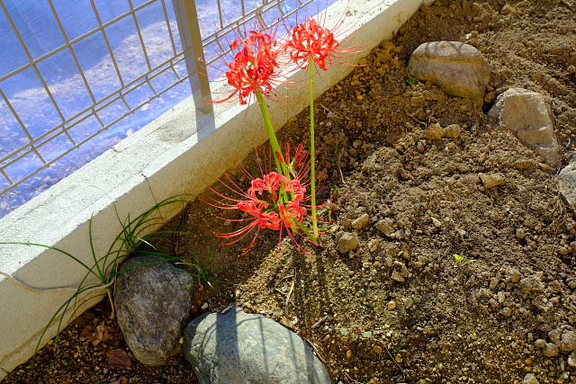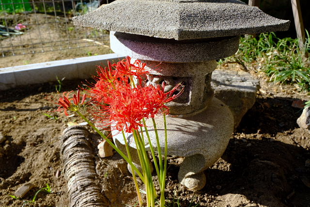 なんとか造り終えたがもう汗だく、ヨレヨレ。段々衰えていくとは言えこの程度でへばってるようじゃダメだ。石灯籠前のヒガンバナはイイ雰囲気に咲いてきた。いい加減に灯籠を移したんだが前のよりピッタシの風景になっている。フェンス脇のヒガンバナも満開、年々増えていきそうな気もするので周囲を石で囲った。