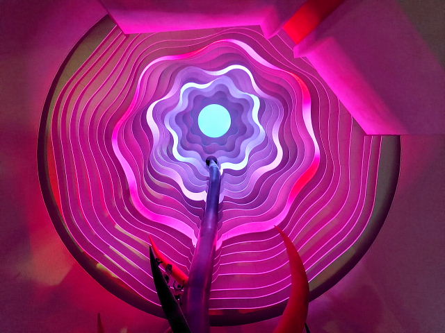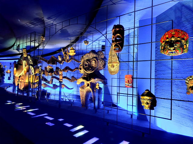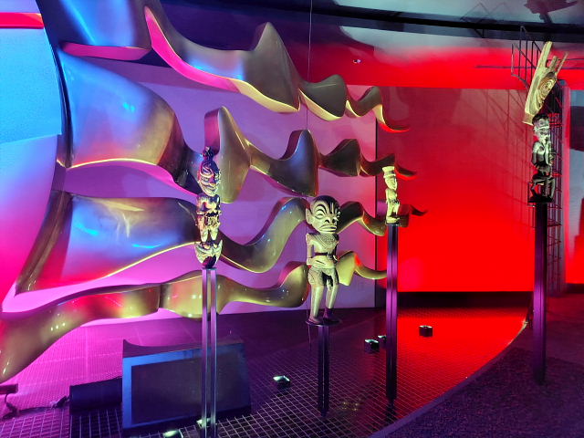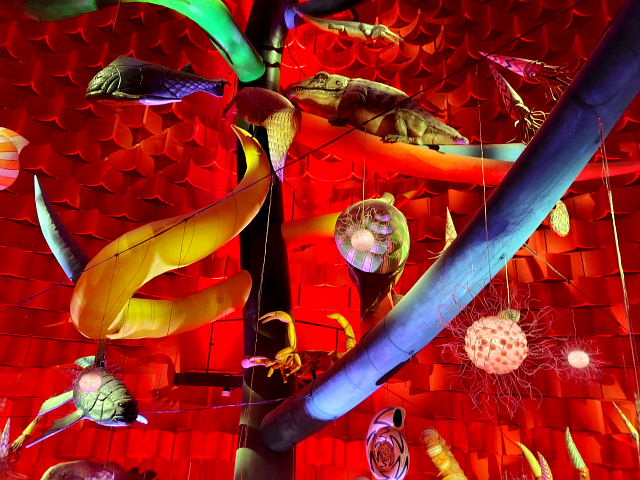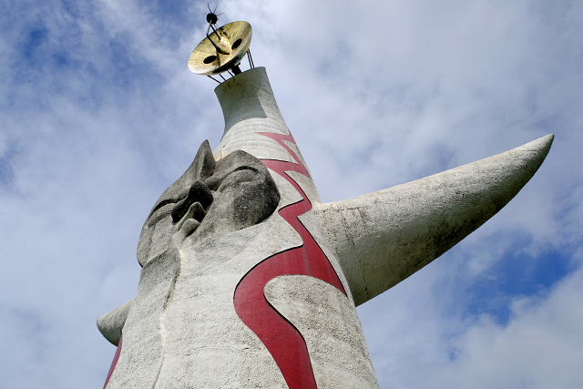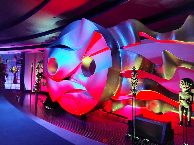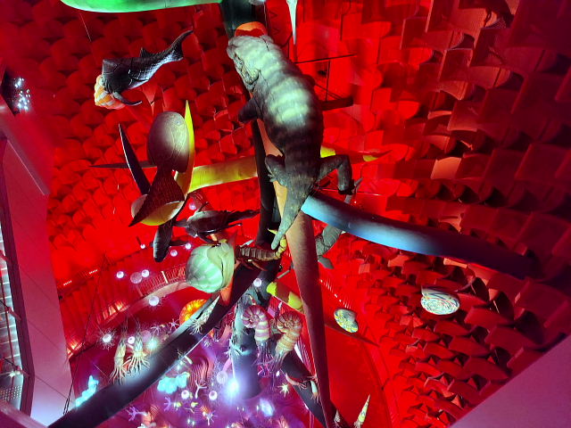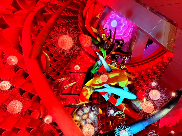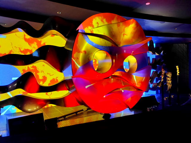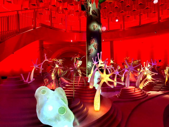 入る前からケチを付けたくなるような施設、でも金払ってここまで来たんだから見てみないと。12時の回に予約していたが20分前に入ると後は自由に見て回ったらイイ。真ん中に人間の進化を表した彫刻“人間の樹”が上階まで伸びていて周りに古代からの動物が配置されている。色とりどり光線で照らすので異様に見えるけど岡本太郎にしてはチープな作品。外の塔ほどのインパクトはない。ネットに載せるのには程良いように思う。中にいたのは30分ほどだったが外に出てホッとした。