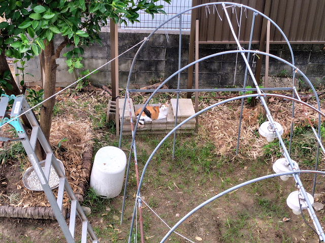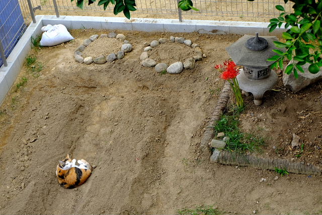 次は深打ちしてから、苦土石灰とやらを蒔いて1~2週間置いてから化成肥料を入れて土壌が完成してから種を蒔く。妻もこんなことやってたんかな。もっといい加減にやってたような気がするけど。だから出来も悪かったし味も……。小谷さんに聞いても“石灰蒔いてから油かすなどを肥料に”と言ってた。初年度はまあやってみよう。夕方頃に下を見るとフーちゃんが畝の谷間でゴロンタしていた。最近はムーよりフーちゃんが外に出てることが多い。
