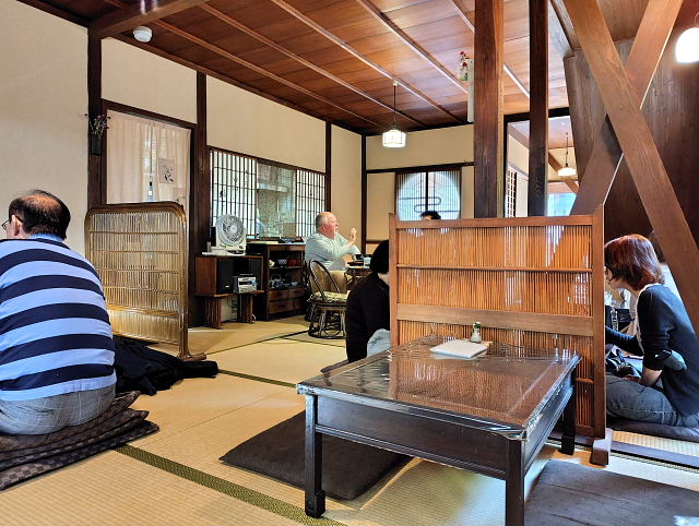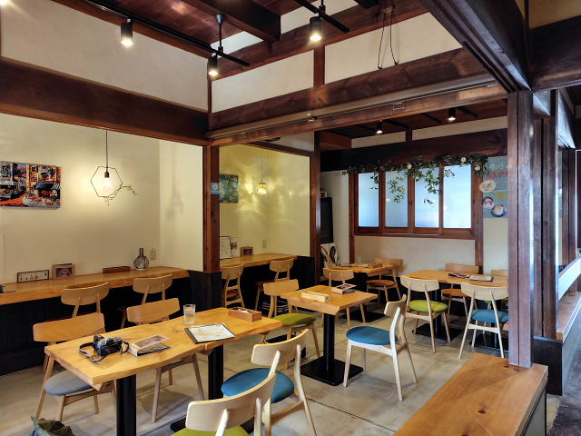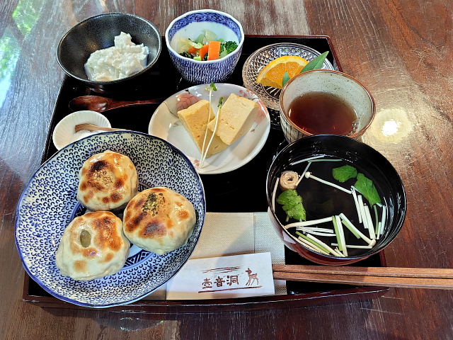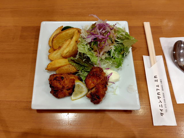 枝豆袋を下げながら写すのは疲れる。あんまり気が乗らんコスモスだった。畑の畦を通りお墓の横を抜け大和小泉駅に向かう。法起寺からだとこっちに行く方が近い。昼は奈良に出て食べるつもり。ベトナム料理にしようかお焼きにするか。12時過ぎたのでベトナム料理の方は混んでるかも、久しぶりに 壺音洞 に行くとここもよく入っており奥のテーブル2個だけが開いていた。お焼きランチとカプチーノにした。ここは水から金の3日間だけ開いているという変わった店。具がタップリ入ったお焼き3個と吸い物、玉子焼き、ヨーグルト。こんなのを食べていると凭れない。