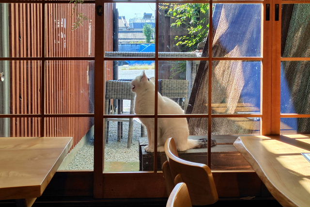 新今宮から大和路線(昔の関西線の方が風情があった)快速に乗り法隆寺下車。インド人観光客(多分家族連れ)が隣に座った。法隆寺は外人観光客にはあんまり人気がないのかこの駅で降りるのを見たことがナイ。今朝の朝カフェは庭カフェとかいう所に決めていたんだが今日は定休日だった。すぐ隣に町屋風の Felice Piccione と言うカフェがあったのでそちらに。中に入ると窓の外に桜耳の猫チャンがいた。モーニングメニューはないのでホットカフェオレ(600円)。名前の感じからするとイタリアン、メニューをよく見なかったんで詳細は分からない。道の向かい側にも同じような町屋カフェがあった。
