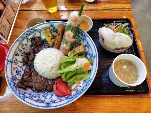 昼はどこで食べよう。妻の思考が乗り移ったのか食べることばかり気になってしまう。トルコ料理も良いけどディスクユニオンから商品入荷の連絡が来てたから梅田の方が都合がいい。となるとこれまた毎度の ビアホイ。地下鉄を乗り換え丁度11時半に店に着いた。何時もブンチャーだから今日は少し変えて“ご飯セット”にした。今まで何回も来てるのにご飯物を食べるのは始めて。大ザルに豚肉、生春巻き、揚げ春巻き、玉子焼き、サラダ、ご飯が入ったのを持ってきた。他はスープと、サラダ付き揚げ煎餅。定番ベトナム料理盛り合わせだな。味はもちろん美味いしボリュームもある。値段はドリンク、チェーのバイキング付きで2100円。単品だと1700円。値上がりしたんかな。入った時は2組しかいなかったけど出る時は満席になっていた。