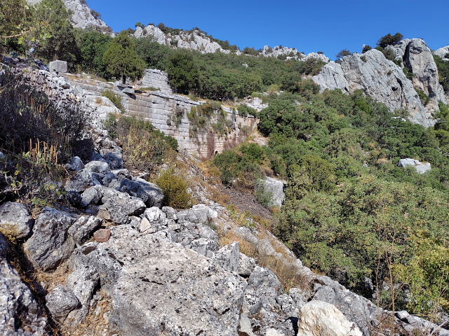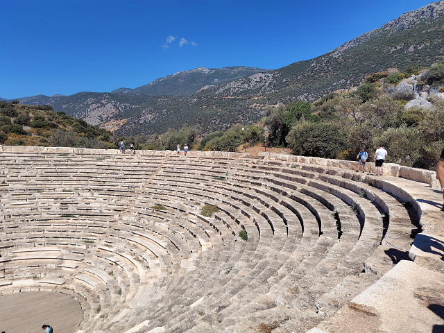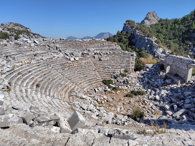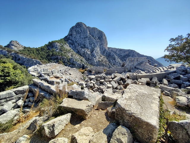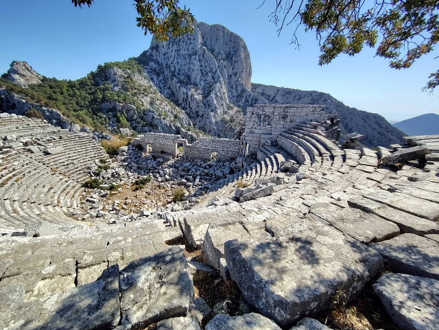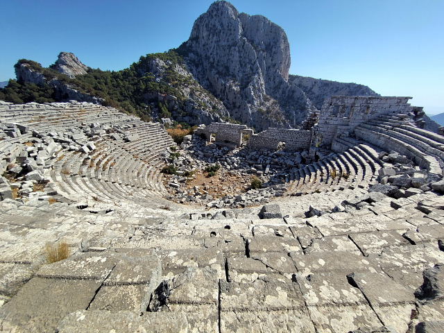 トルコで一番行きたかったのがリュキア時代の古代劇場が残る Termessos(テルメッソス)。でもここは通常の観光ルートからは外れ個人で行くには中々体力が要る。公共交通はないからツアーに申し込むかタクシーをチャーターするしかない。ネットではトルコ旅行の話がワンサカあるけど此処に行ったというのは少ない。あってもマイカーかレンタカーを借りて(トルコ在住の人)、ツアーに参加したのばかりでこちらが知りたい“いくら掛かった”との答えはない。此処に行くためにトルコ(アンタルヤ)に来たのに値段が高いから止めたんじゃ来た意味がない。トルコのタクシーについても、ぼったくられるから気をつけろとかばかりでいい話がほとんど書かれていない。まあネット情報などは現実に行った人間が書いてるのかどうか怪しいから当てにはできない。現実にタクシー乗り場で聞いてみた、“テルメッソスの往復はいくらだ”、“4000リラ”、“ユーロでは”、暫く考えて“80ユーロ”。ネットに出ていたタクシーツアー(何人なのか不明)は9500円(55ユーロ)くらいだったが集合場所まで行かねばナラン、こちらはホテルまで来てくれる。20年以上前のロンプラでは30ドル前後と書いてあったから物価高騰の今だと100ユーロくらい吹っかけてくるかと思っていたが予想よりは低かったのでゴー、“明日朝9時にホテルに来てくれ”。この金額を高いと感じるか安いと思うか……その人による。訪問した感想は素晴らしい、イメージ通りの遺跡だった。カシュのが海辺のシアターなら、ここは天空のシアター、観客席は神様達が座るんだろう。ここもイイ、残りの遺灰を全部蒔いた。
