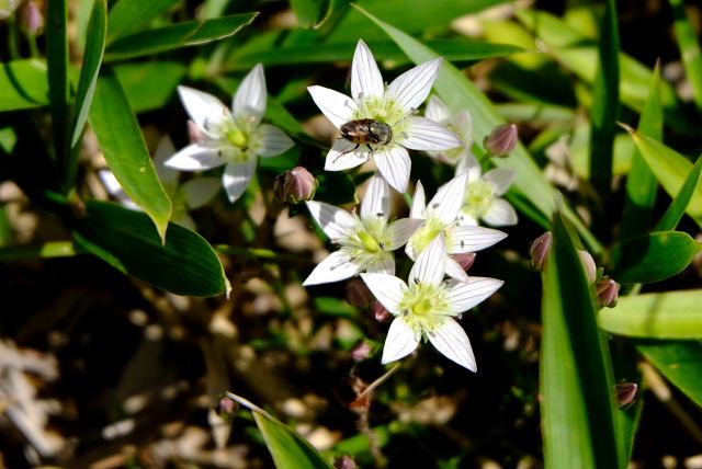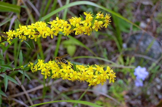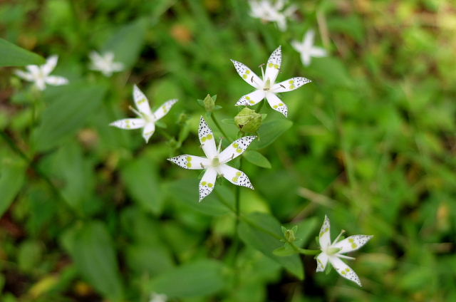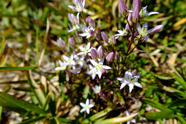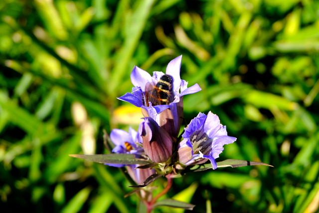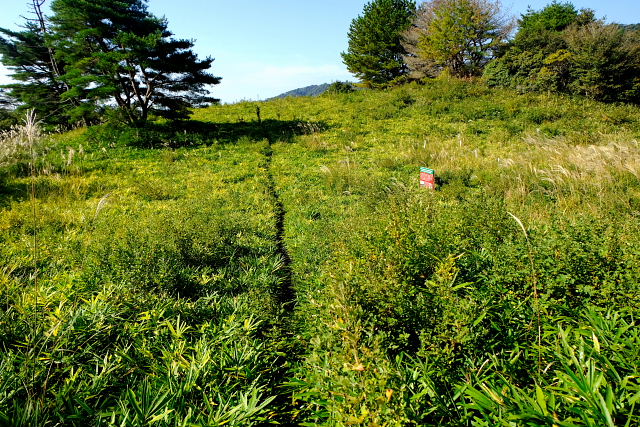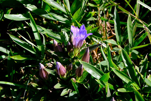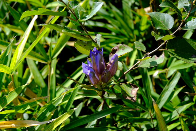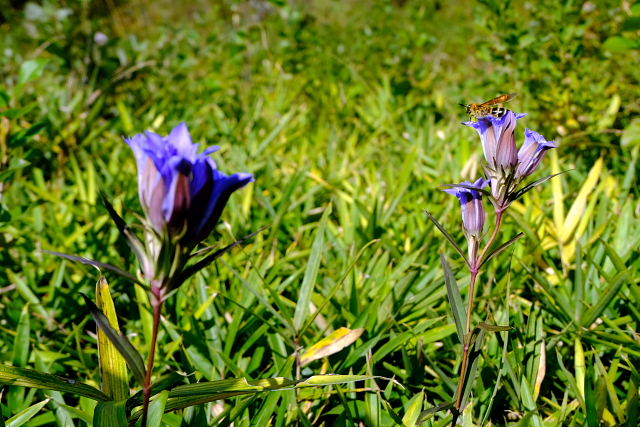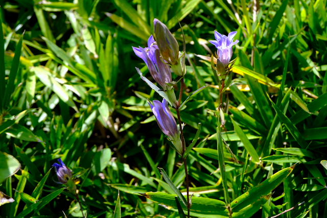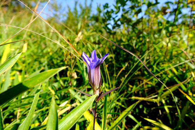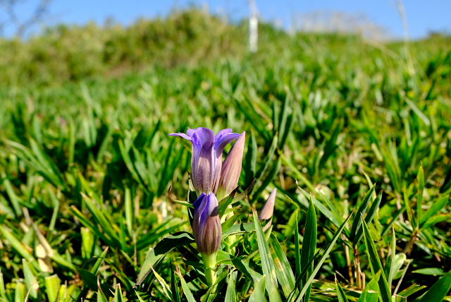 出始めからそんなこと思いながら登ると……その予想通りショボショボ咲き。足の踏み場がないほど咲いていた年が懐かしい。一見した所では普通の緑の草原、よ~く探すとポツリぽつりと紫の花が出ていた。花が一つ付いている茎ばかりで寂しい感じ。草原上の休憩地周りになんとか固まって咲いている所があった。もう1週間遅らせたら少しは咲いてくるだろうけど株自体が少ないから。センブリはここも良く咲いていた。