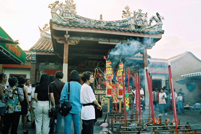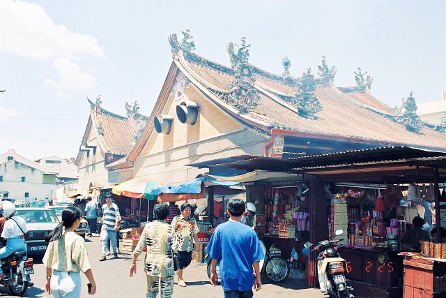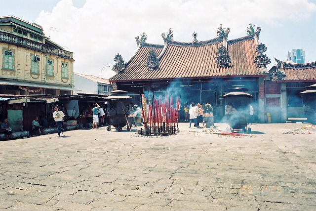 ピット通を南西に戻るとグリーンに彩られた寺院があった。中に入ると線香の煙が充満。通の突き当たりに塔が立っていた。地図にはMasjid Melayuと記されている。塀で囲われていた。次はクー・コンシ寺院。山門は工事中で分かりにくかったが横から回り込んで入るとゴテゴテ彫刻の本堂があった。キョンシー世界のような完全な中国寺院。観光客も少しいた、白人カップルは何処にでもいる。日本人は誰もいなかった(多分)。さっきのモスクも白人が写真を撮っていた。またピート通に戻り東に歩いてKuan Yin Temple(観音寺)に行くと寺院前は縁日みたいな屋台がいっぱい出ていた。境内では桃色の線香束を持った人が一心にお祈りしていた。ここは物乞いがいなかったし観光客も少ない。