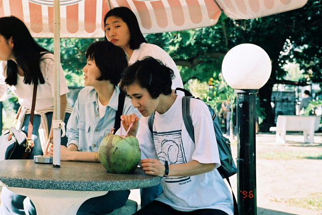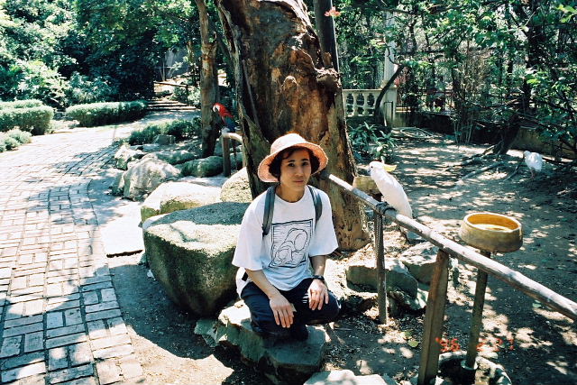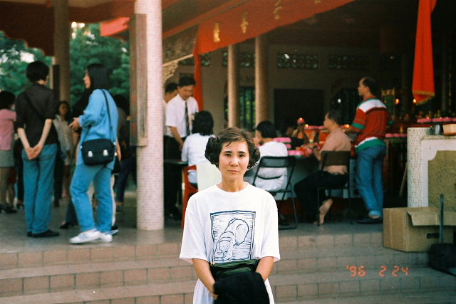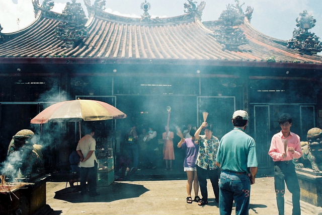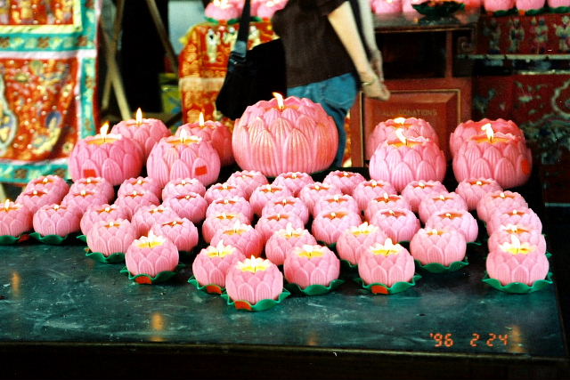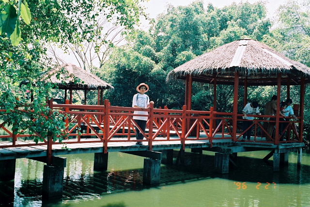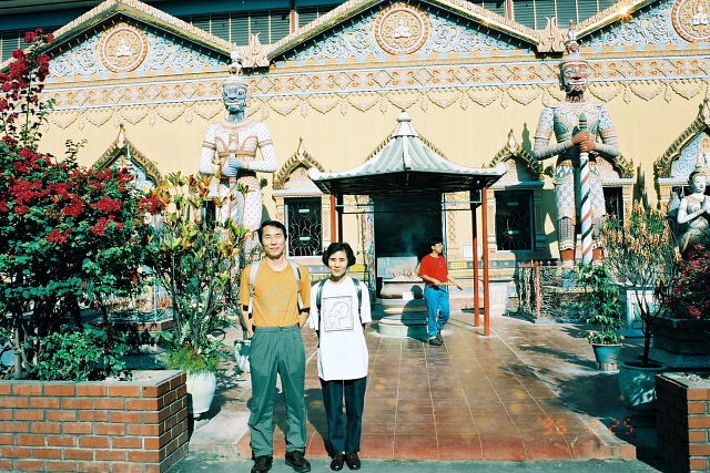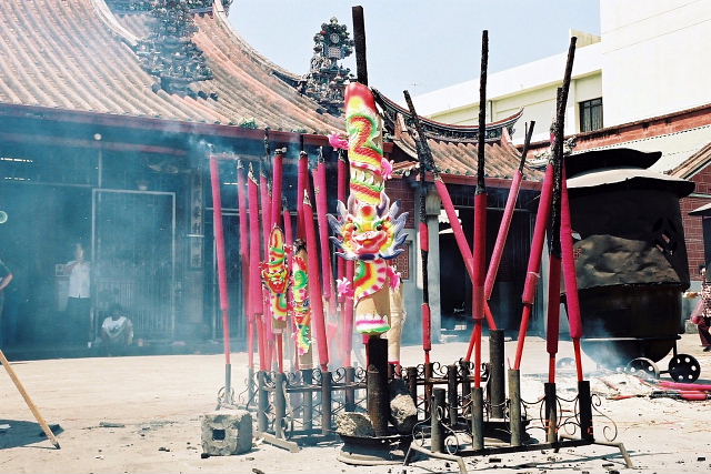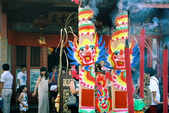 外に出たら台湾の仏陀、四面八臂の阿弥陀様?などがいっぱい。全て赤いローソクなので血が滴っているように見えた。ナイロンズボンとウィックロンTシャツだけなのに汗ばんでくる。お次は砦。取り立てて言うような所じゃなかった。椰子の実ジュースを飲む。生温い清涼飲料水てとこかな。ボルネオで飲んだ時は冷蔵庫で冷やしてあったから美味かったんだ。公園にはマンゴーがぶら下がっていた。ごく普通の風景なんだ。