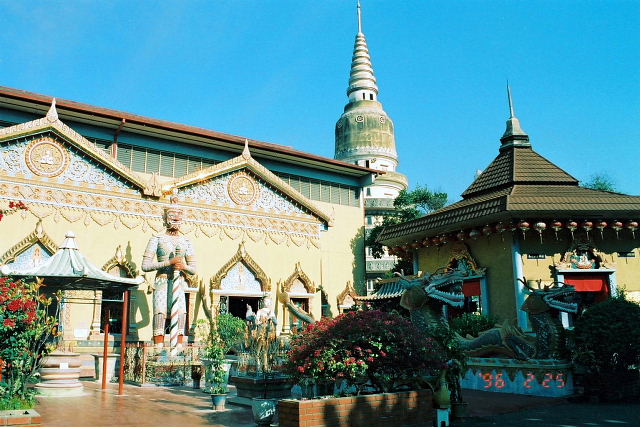 あとの2人組、3人組(どっちも女)が中々出てこないのでかなり待った。やっと出てきたのは6時半、みんな大きなケースを引いている。この時間になっても明るくムシッとしている。日没は7時過ぎとのこと。ライトバン(7人乗り)で出発。ホテルまでの途中で蛇寺観光。車を降りるとドリアンの臭いが充満していた。食べたかったんだが他の女性たちは興味がなさそうだった。参道脇には片足、片手他の障害者乞食が屯していた。境内に入るとお香の臭いがモウモウと立ちこめ、観光客の頭に蛇を載せ記念写真(ヤラセっぽい)。ここの蛇は全てヨロイハブ、三角頭で薄緑の縞模様。見た感じは温和しそうだが猛毒だから……大丈夫なんかな。昔はもっとウジャウジャいたそうだ。