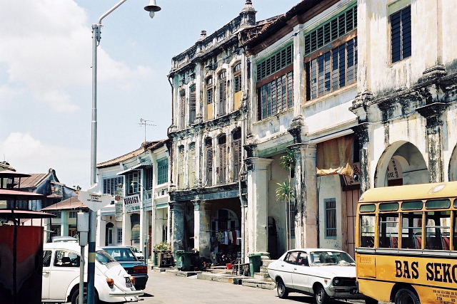 さてこれからは観光地じゃなくJTBとつるんでいる土産物屋巡り。最初の免税品店、ピューター製品などの店で客一人に店員が一人張り付いてくる。どのコースでも市内観光を入れるのはこんな店に誘導するため。バッグ、時計、宝石……観光客だけしかいない。どれも興味ない物ばかりで早く出たくなった。添乗員はノルマがあるから仕方ないんだろう。外の空気が吸いたくなり街に出てみるとペナンの雰囲気がする。白壁の家、食べ物屋台、緑の街路樹など。