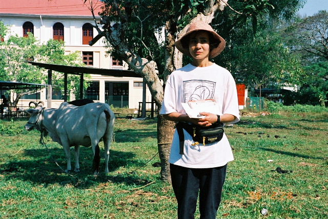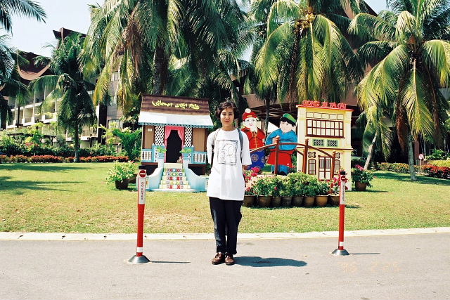ゴールデンサンズ・ホテル先で山側に曲がり小道を辿ると牛が飼われていた。中国人学校、マレー人学校、民家の間を歩いていく。観光客のいる表通りは綺麗だが一般集落に入るとゴミも目立つ。中国寺辺りで道路工事中だったので引き返した。ホリディ・インの横に出て昨日のバティック店(インド系)に寄ってみた。一つだけ値切って買った。
