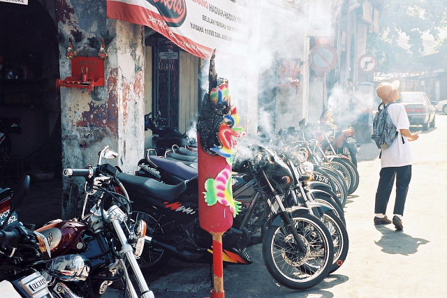 マガジン通を抜けバンタイ通を曲がると海が見えてきた。今10時半、コムター周辺の交通量がメチャ多い、特にバイクが。みんなヘルメット被りノーヘルはいなかった。街中には中国正月の名残か大きな彩色線香が家々の前で燻っていた。カラフルな仁王様のような絵柄。白壁の通に煙の臭い、この辺りは中国人街なのか。