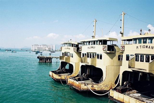 1時半頃バターワースに戻りすぐにフェリー乗場。ペナン島にショッピングに行く人も多そうだ。乗場3階の百貨店みたいな所で果物を探したがドリアン、ランプータンなどはなかった。20RMコインを投入して乗船。フェリーには白人バックパッカー風のが何人かいたが日本人は見当たらない。真正面にコムターと時計台が見えている。熱帯の昼下がり心地良いエンジンの響きにウトウトしてきた。ボルネオ島ほどの自然はないけど、空は快晴、海面がキラキラ光り眩しい。ペナンヒルがボンヤリ霞んでいる。行き交う船はどれも満杯。来る時は白い客船2艘停まっていたが3艘になっていた。