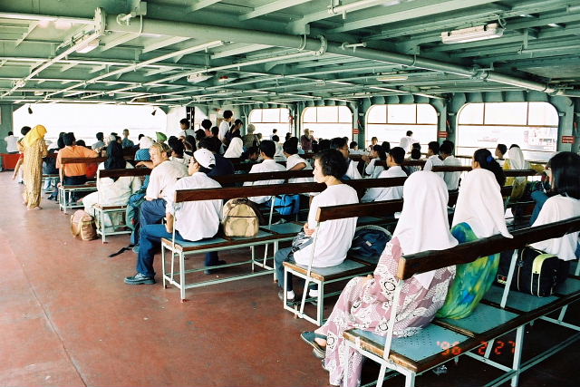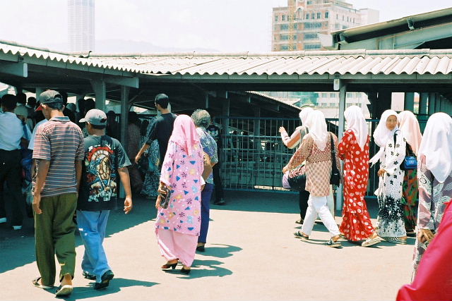 バターワース行フェリー乗り場まで来ると色鮮やかなトゥドン姿の女性が目立ってきた。ちっちゃな子供からバアちゃんまで好みのを付けていた。足下は裸足のサンダル履き。ヤオハンの下着売り場では白黒のブラ、カラフルシャツが並べてあったからムスリムでも違いがなさそうだ。JTBの観光コースだとこんな風景は見られない。