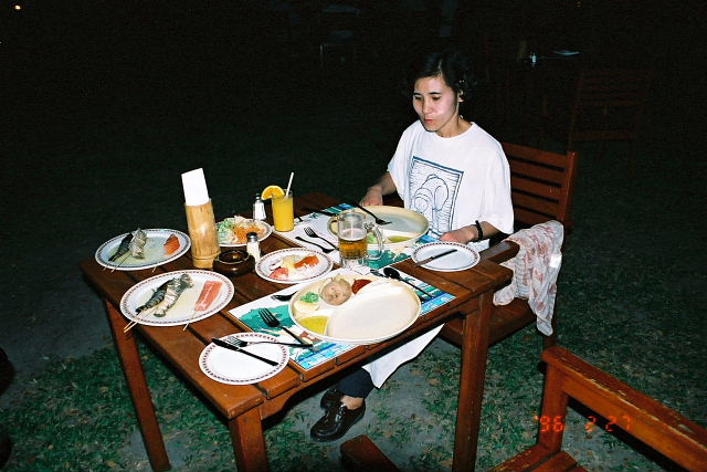 ビーチで一泳ぎ。すぐに深くなり遊ぶ雰囲気じゃない。波は高いし透明じゃないし。ゴミ、廃油ボールなどはなかった。夕食までバルコニーでコーヒーを飲んで過ごした。ノンビリした旅だ。7時半夕食、バーベキューレストラン(テピラウト・バー)でシーフード・バーベキュー(35RM)。ロブスター、キングプローン、貝柱、サーモンとサラダバー、スープ、コーヒー、紅茶、プチケーキ、フルーツ。焼くのは時分でやる。美味かった。椰子の木陰で星を見て波の音を聞きながらのディナー、いい年になっても良いものはイイんだ。
