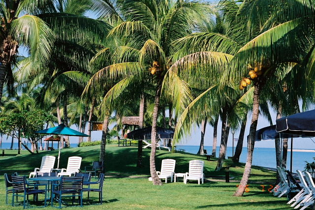 苛ついてきて散歩にタンジュンアルビーチまで歩いた。水は濁ってるけどずっと向こうまで遠浅になっている。濁ってるのは砂が細かいからで沖の方は澄んでいる。屋台が並んでいる所まで歩く、歩くと砂がしまってるので固く感じる。プ~ンとドリアンの臭いが漂っている。屋台に並ぶはトゲトゲのドリアン。小さい奴(14RM)を買って食べてみた。ネットリした独特の風味が口中に広がる。今日一番の収穫だな。ホテルの人間より外の人間の方が気さくで楽しい。サティとヤシジュースは次の機会にしよう。