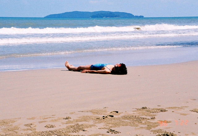 6時半起床、朝はいつものガーデンテラスのモーニング・ブッフェ。やっぱり美味い。今日はノンビリとこの周辺で遊ぼう。9時頃出発。タンジュンアルビーチを先の方まで歩く。引き潮なので遠くまで浜が広がっている。長閑なものだ昨日と違い誰もいない。2kmほど歩いた所で詞子を砂に埋めて遊んでいると段々潮が満ちてきた。真正面のガヤ島を見ながら寝転がっていると全てを忘れてしまう。今日も快晴、少しだけ寝そべったつもりだが首筋と脚がヒリついてきた。浜には浜ヒルガオ見たいな花が咲いている。