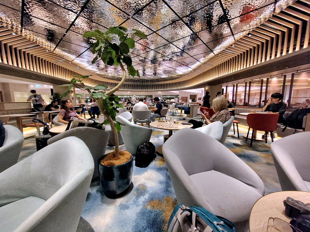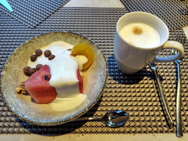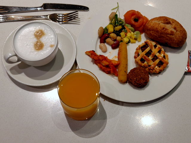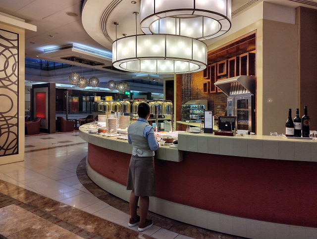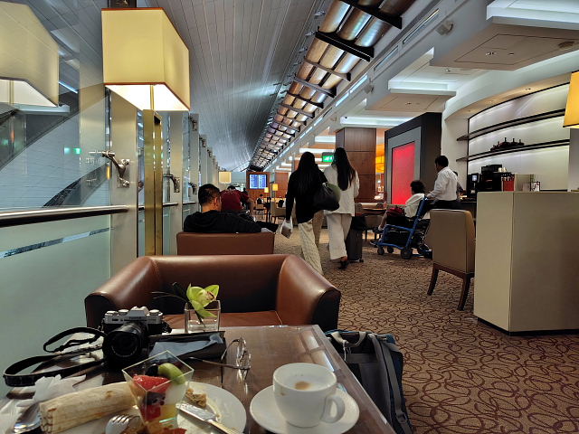 ラウンジは新しい所の方がイイ(とも言えんけど)。こちらとしては一遍こっちに入りたかったんだ。ネット情報なんて何時のか分からんし誰が書いてるかも分からんからあんまり当てには出来ない。さて、新しいラウンジはこの前入った貧相なラウンジ(ANAラウンジ)よりか格段にイイ。外国(アジア)の空港と較べるとマダ落ちるけど関空でやっとマシなラウンジが出来た。全部食べてみたいんだが……エミレーツの機内食もあるしあんまり食べる訳にはイカン。軽くお寿司、おかずとカプチーノ、フルーツだけにしておいた。入ってる人は多いけど広いのでユッタリ過ごせた。でも日本のラウンジで横に五月蠅いグループが来ると苛ついてくる。外国なら言葉が分からんからそうでもないんだけど。特に延々と仕事がらみの話をされると旅に出る雰囲気がぶち壊しになる。そんなのがいたから早めに退散した。