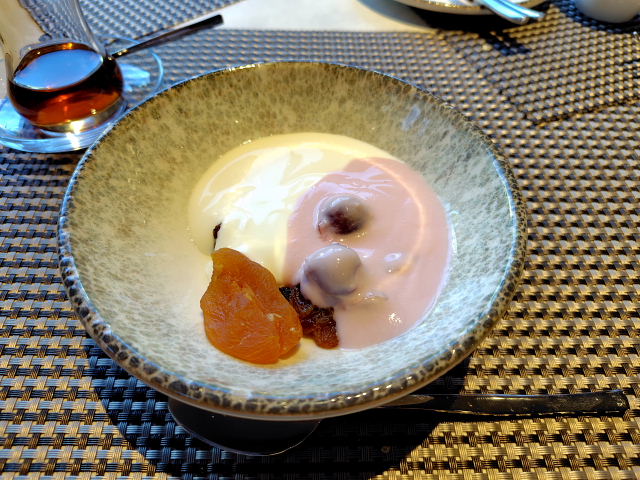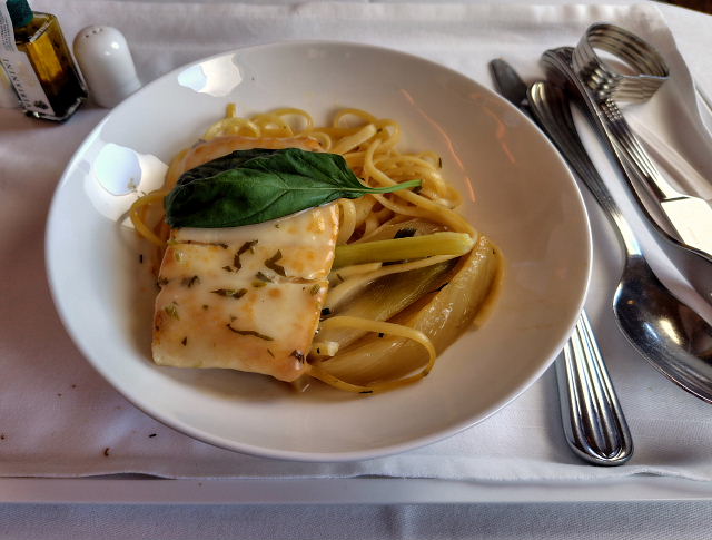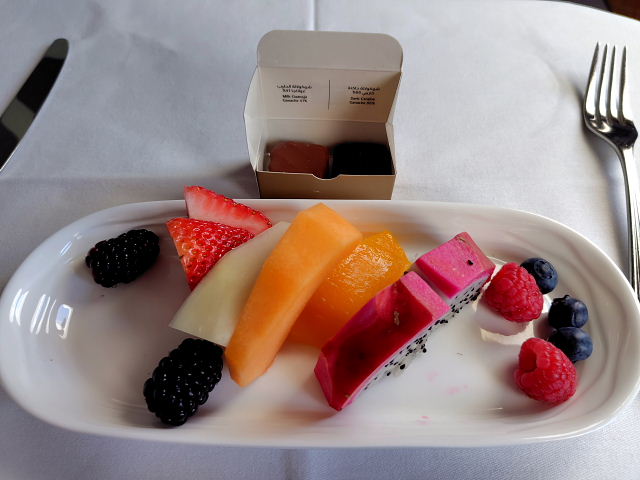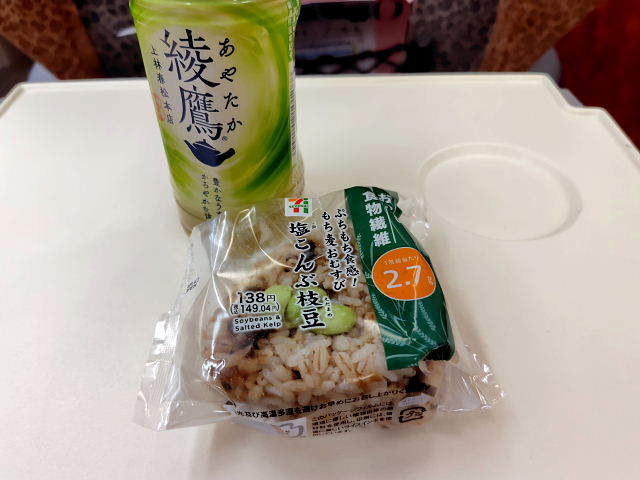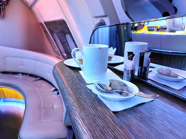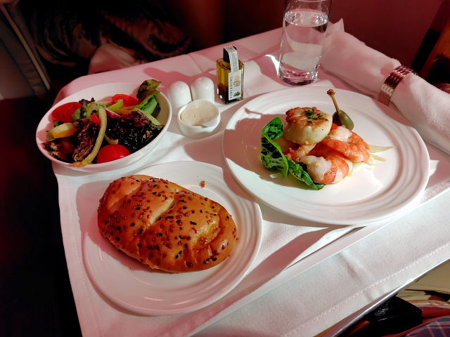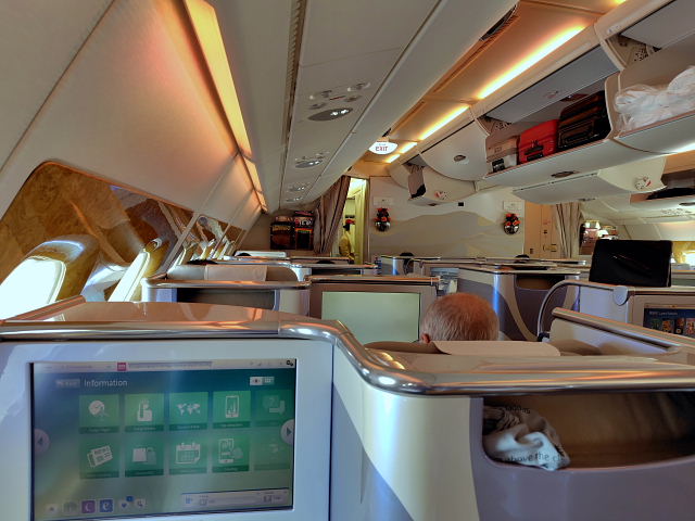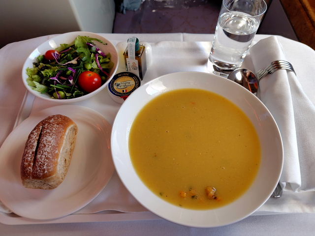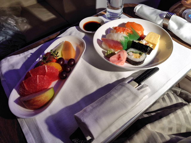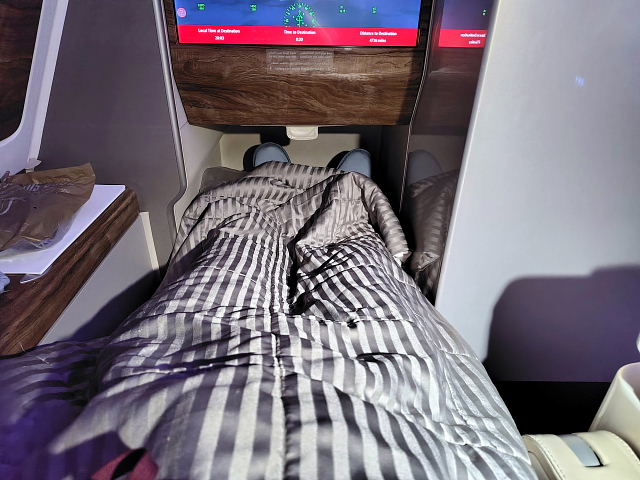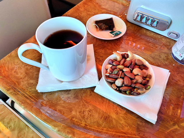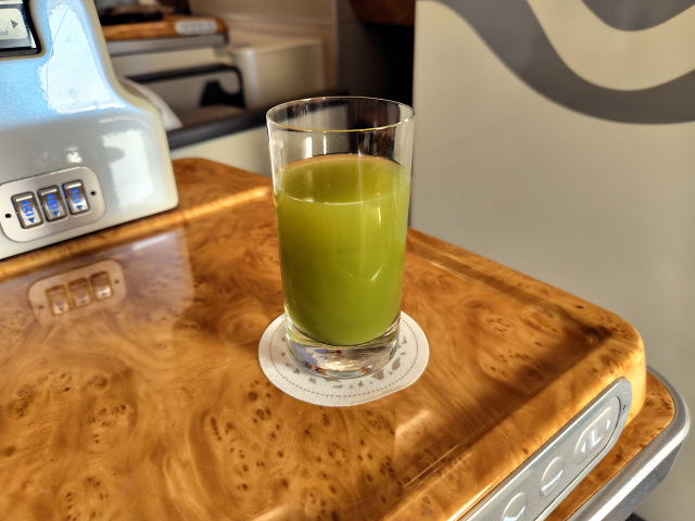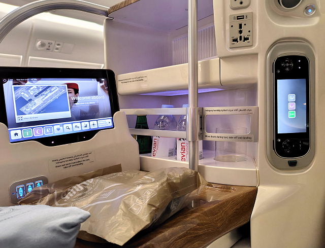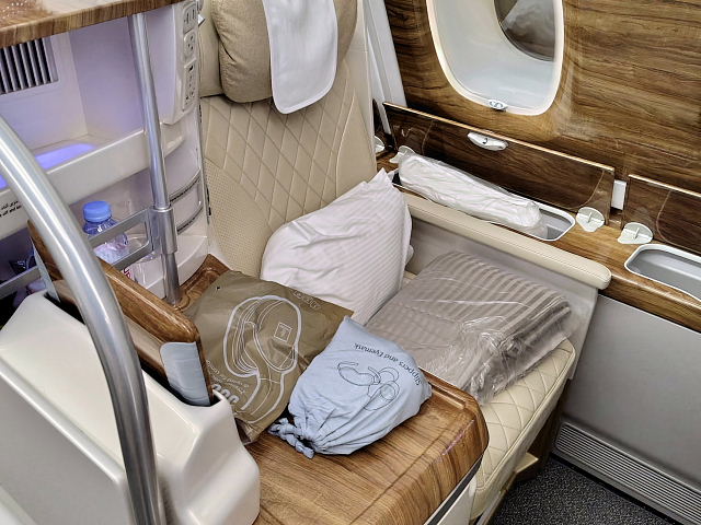 1階席はエコノミー、プレミアムエコノミー、2階は全部ファースト、ビジネスと完全に区切られている。搭乗する時も1階から2階の階段を上がらず2階入口に直接通路が結びつけられていた。窓際席、フルフラットシート、ミネラルウォーターミニボトルと何かが席横のミニバーに入っていた。男性用アメニティキットをくれたので“女性用に変えて欲しい”と言うと両方置いていってくれた。初日からこんなにもらったら荷が重くなるなあ……パジャマも持ち帰り出来るんだがそっちは帰りにしよう。