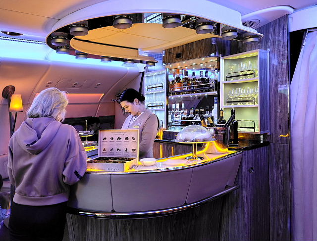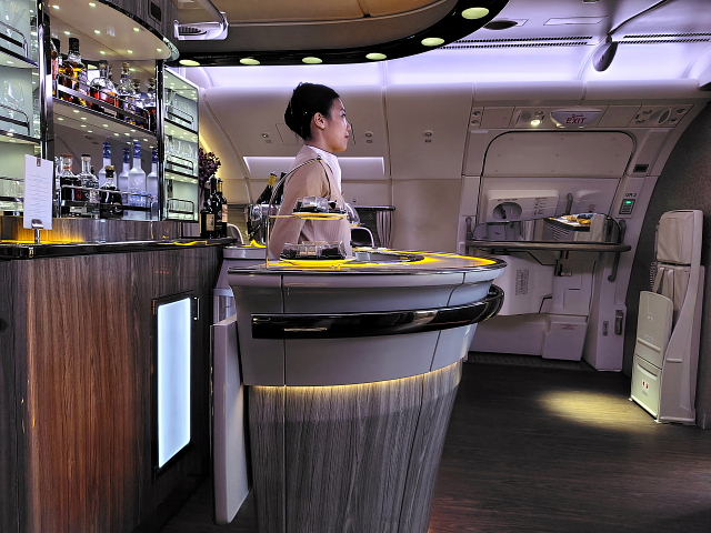 離陸して1時間ほどで機内食(軽食)が出た(ドバイ時間夜8時)。一番軽そうな寿司セットとフルーツ盛り。味はイイ、タイ航空なんかよりもズッと。この前(5月)に乗ったタイ航空の機種よりも格段いゆったりしている。飲んでばかりいるので2時間に1回トイレにいっている。座席後方には機内のラウンジも設けられていた。こんな飛行機に乗るのは始めて。ここはバー主体でアルコールばかりだがカプチーノを注文したら後の調理場で造って持ってきた。ここのカクテルも試してみたくなってきた、次は……。エアラインスタッフはいろんな国の寄せ集めみたい、ラウンジは白人ヨーロッパ系かな。アジアのエアラインみたいな細身美人じゃなくみんなガッチリした体型