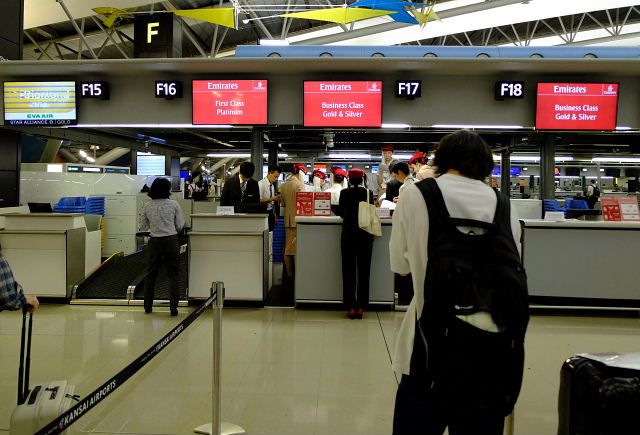 関空着7時40分、いつも人で賑わっている関空も夜発になると極端に少なくなる。4階の国際線出発ロビーに行くとエミレーツ航空の列が出来ていた。他のエアラインと違いエミレーツはビジネスクラスの乗客も多い。いつも他の客の荷物を見てるんだが全員大きなケースを預けている。サブザック1個なんていう御仁は……見渡しても他にはオランなあ。プレミアム・レーン・カードとラウンジ名が印刷された搭乗券を受け取る。搭乗券にラウンジ名が印刷されていた。KIXラウンジKANSAIとなっている。ネットではエミレーツ航空はノースラウンジとなってたけどこちらに変わったようだ。
