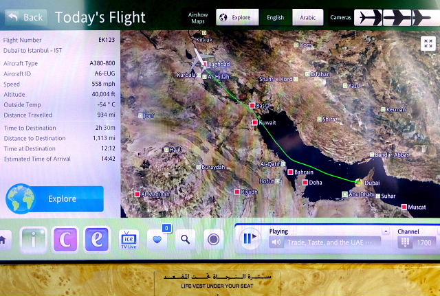 イスタンブール行きに搭乗する時、ビジネスクラス・ファーストクラスは2階から飛行機には入れるようになっている。ラウンジから下に降りようとエレベーターの1階を押しても反応しない、2階だとOK。上級クラスの乗客が間違ってエコノミー客と同じにナランよう気遣ってるんだ。ここまでキッチリとランク分けしてるとはさすがにエミレーツと言いたくなる。イスタンブール行きも前と同じA380。連続して乗ると勝手が分かってくる。乗客は関空からドバイほども多くなかった。出発が少し遅れた。離陸1時間ほどで食事、食べ過ぎてるのでコーンスープ、鮭のパスタ、フルート盛りだけにした。味はドバイまでの便に較べ若干落ちるようにも思えた(こっちの腹具合の所為かも)がそれでも他のエアラインに較べるとマシ。