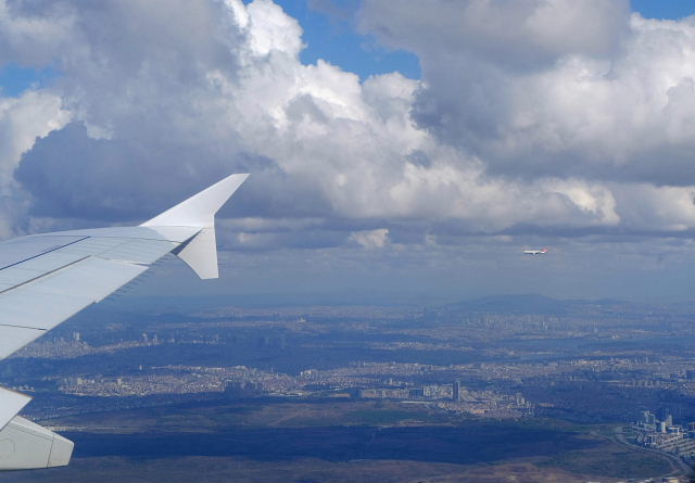 12時になったのでゲートに行くと……またディレイ、12時45分が13時15分発になっていた。当初からだと1時間遅れることになる。トルコ航空では遅れるのが日常なんかな。ナンとか機内に入ってみると機種はA330、国内線なのに大型機なんだ。飛行時間が1時間チョイなのに一応機内食(パンとドリンク)が出た。飛行コースは空港から一旦海に出てからUターンして陸地に戻り、ウスパルタ、アフヨン、キュタフヤ上空を通りイスタンブール手前で黒海に出た。もうすぐ空港かと思ってるとまた地中海側に進路を変えてから空港に向かった。これが普通コースなんかな。