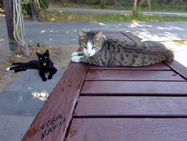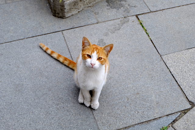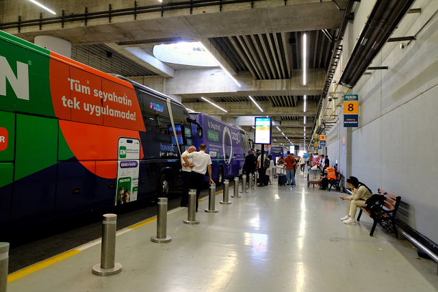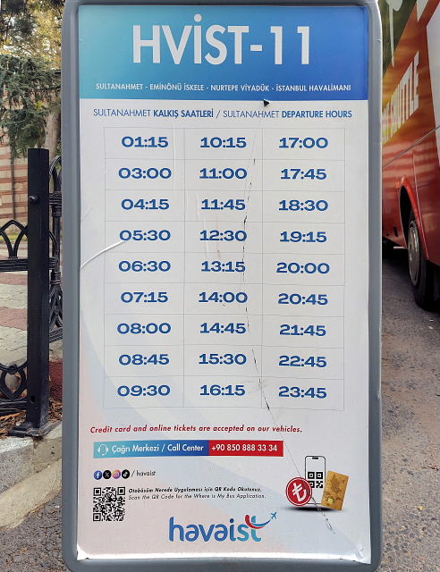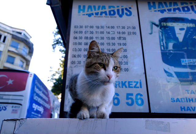 タクシム行15時15分のは満席で出発、次のは15時45分。30分に1本出ている。チケットを売りに来たのでクレジットカード(タッチ決済)出払う。料金は355TL、ネット、本では275TLとかいてあったがまた値上がりしたか。リラが暴落してるのでユーロに合わせるとこうなるんだろう。どれを見ても約1時間半掛かるようなことを書いてるが1時間でタクシム到着。到着場所は同時に発車場所、サビハ・ギョクチェン空港行バスのすぐ後。明後日空港に行く時はここから乗るんだな。時刻表前には猫チャン、トルコだ。
