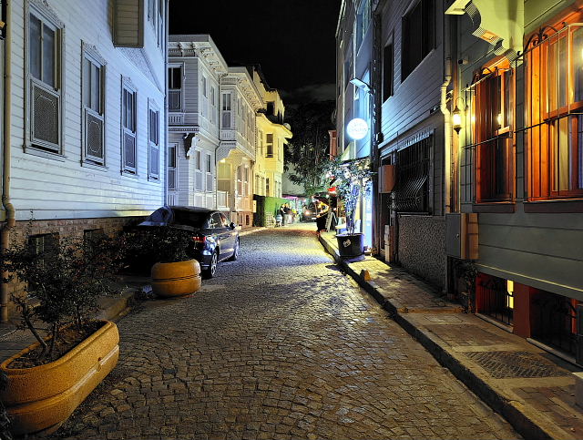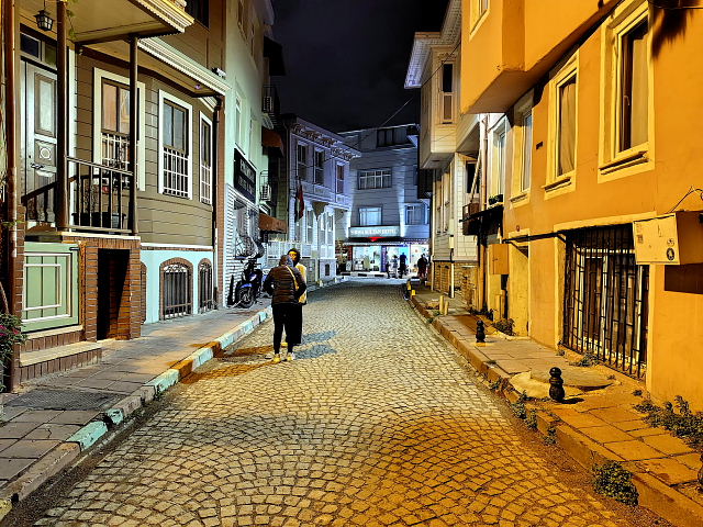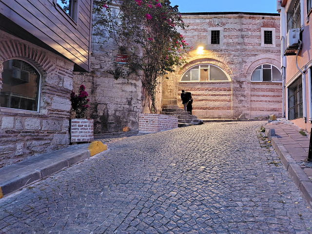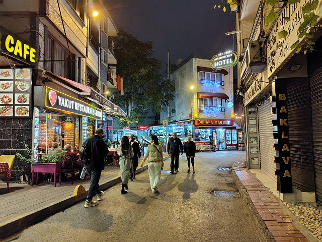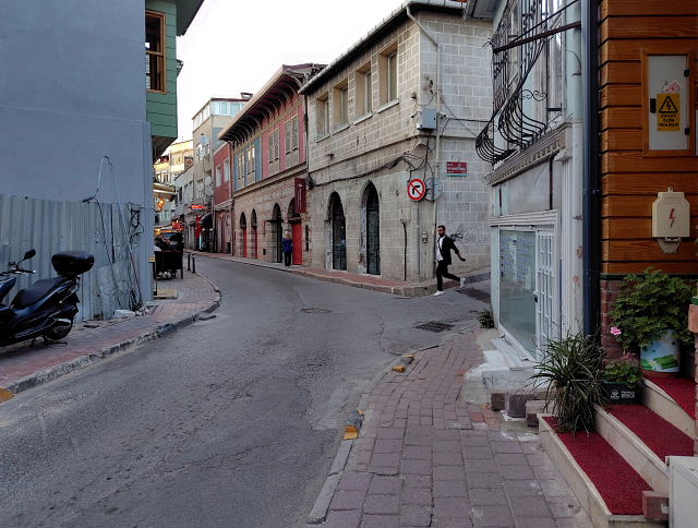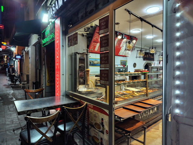 チョコマカ食べ続けてるから夕食を抜こうと思ってたが、レストランの様子を見ておくのもイイか外に出た。7時過ぎて暗くなると辺り一帯の道路にレストランが並び何処も満員になっている。メニューを見ると600~1000TL、こんな場所柄どこも高目設定。どこにも入る気がしなかった、Yaşam Et Lokantası。ミグロスジェット(スーパー)でジュースとハムを買う。入り組んだ路地を歩いてると人が少ないロカンタスがあった。看板にはイズミール・キョフテとか書いてある。入ってるのは観光客じゃなく地元の人だけみたい、よし食べてみよう。ピラフみたいなのと、キョフテ、茄子の煮物で320TL。味は……好みじゃないかも、でも人が少なくノンビリ食べられた(この要素は一番重要)。タイと同じように散歩用にサンダルを履いてきたが石畳の坂道は歩きにくい。トルコ人でサンダル履きはほとんど見かけなかった。サンダルは湿っぽく平地が多い東南アジアに適しているが、乾燥して石の道が多い国には合わない。