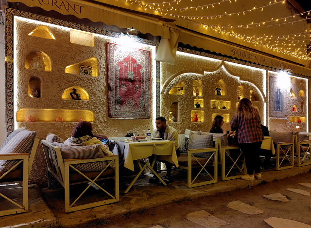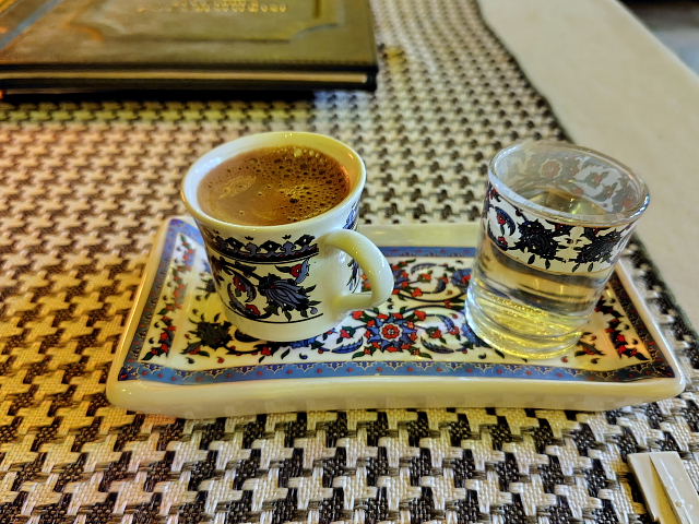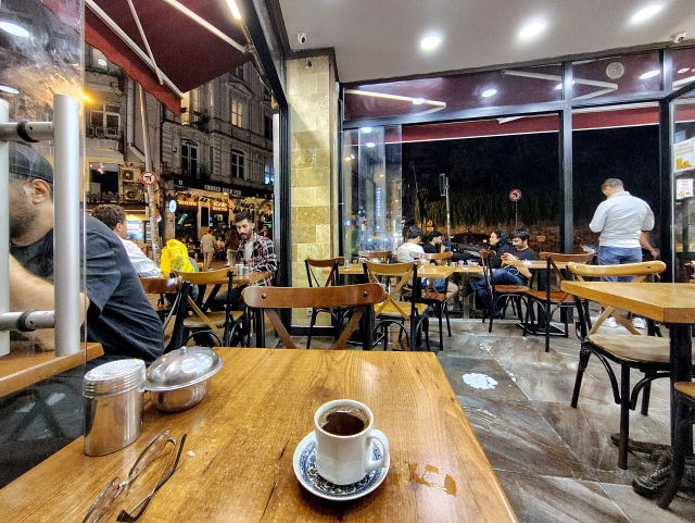 道が入り組んで何処をどう歩いたのかサッパリ分からんけど宿まで帰ってきた。界隈は若者達で盛り上がっている。お土産用の小皿、菓子類も良さげなのがあったけど帰りにしないと。角のレストラン(名前不明)のメニューを見るとターキッシュ・コーヒーがあったので一服(100TL)。カップのサイズを聞いてきたから、それに合わせて造るんだ。9時過ぎると眠たくなる、日本時間3時なんだ。