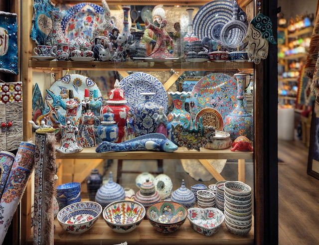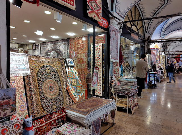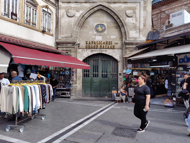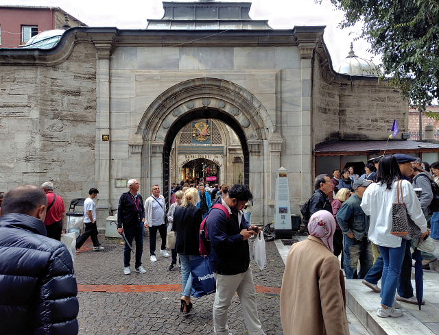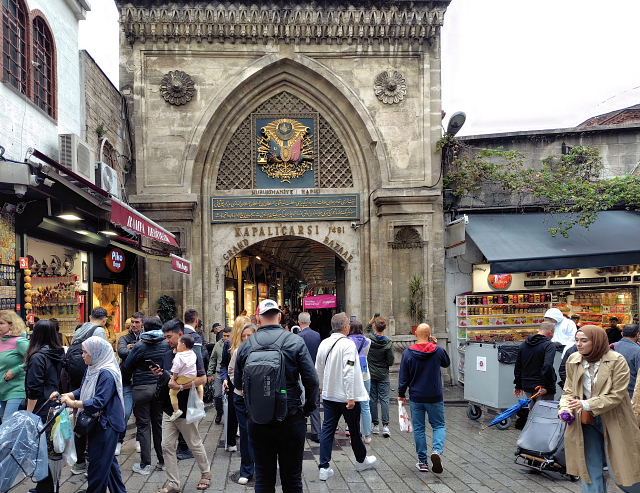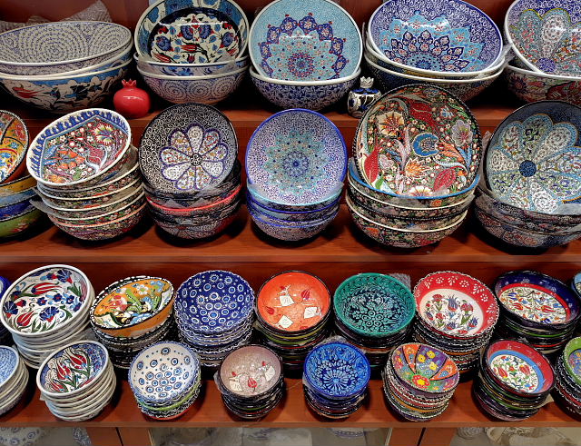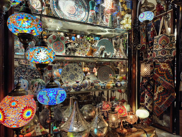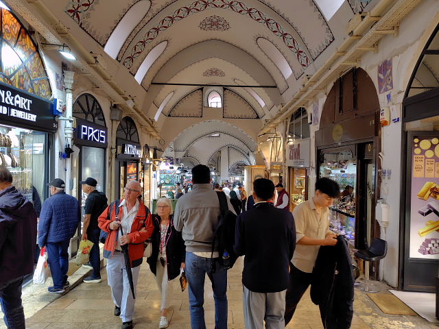 イスタンブールの一大名所、世界でバザールと言えばマズここが上がってくる超有名スポット。人の波が続いている。金属探知機のゲートを潜り中に入る。でもイメージしていたのとは違うなあ。写真写りが良いように綺麗に整備され土臭い物は一切置いてない。いかにも外人向けに造られ中近東バザールの雰囲気は全くナイ。高目設定の土産物屋、貴金属店などの店ばかりで生活に密着したような店はなかった。お香の臭いも、生鮮食品の生臭い臭いも漂ってこない。中は迷路状で写真を見ていた限りでは異国情緒がありそうに思えたが、聞こえてくる言葉は英語、フランス語、ドイツ語、ロシア語……など。こちらを見て“ニイハオ”と言ってくる奴が多い。同じ物を売る店ばかりが集まっていていくら歩き回っても珍しいのが出てこない。娘の土産用に小鉢3個(450TL)とそれを持ち運ぶバッグ(500TL)を買っただけ。バザールの外だと多分これの2/3ほどで買えるんだろう。タクシムやシルケジの方が安目だった。段々中にいるのが疲れてきて外に出た。