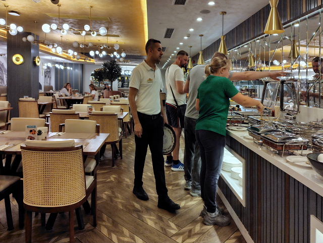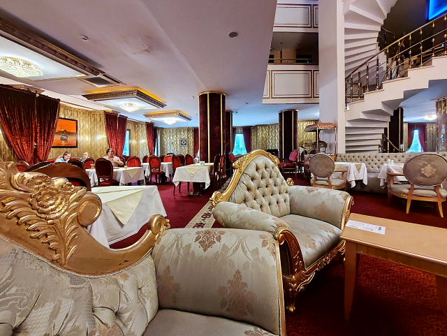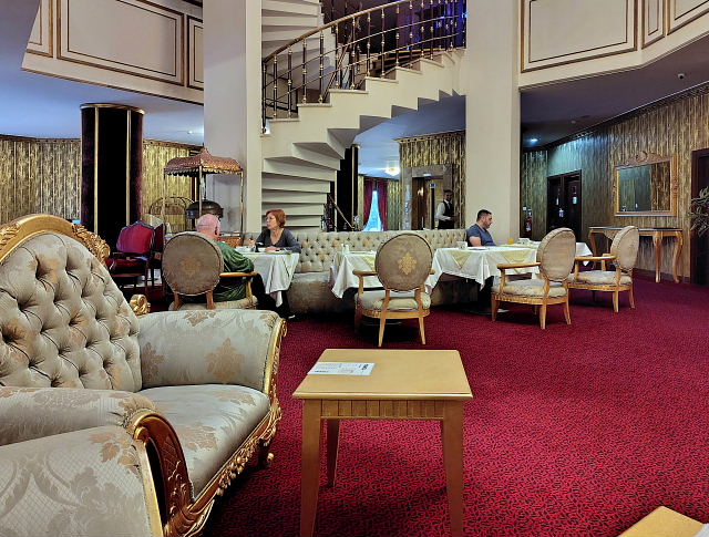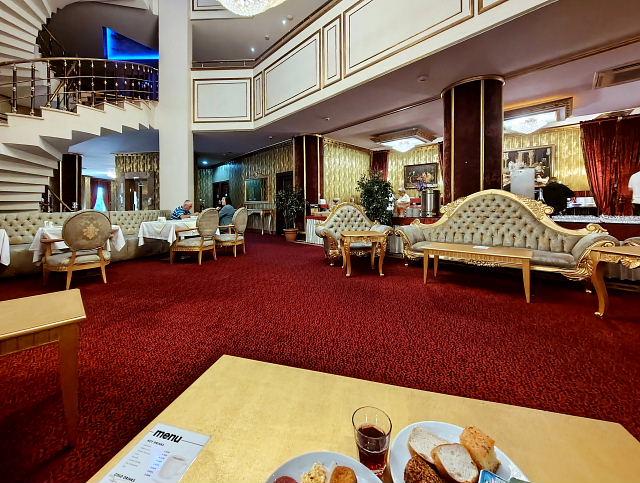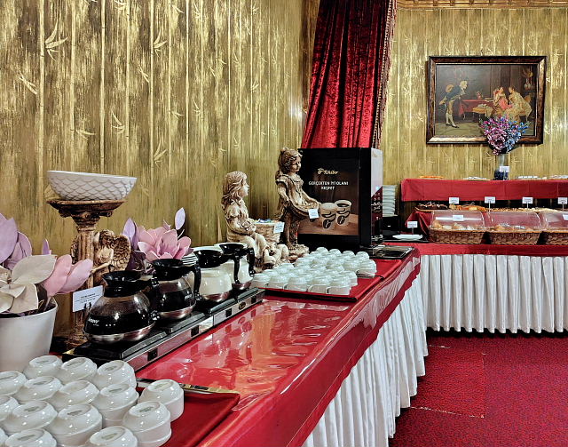 トルコ最終日のブレックファースト、昨日のとはホンの少し替わっていたけど味の傾向は同じ。トルコ風スパイスは変えようがない。本当に豪華な食事処だ。カラフル照明の天井からシャンデリアがぶら下がりテーブル、イスも風格がある。パイプ椅子を並べたチープな宿とは各が違う。