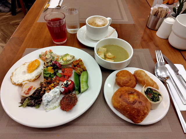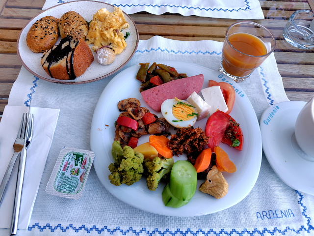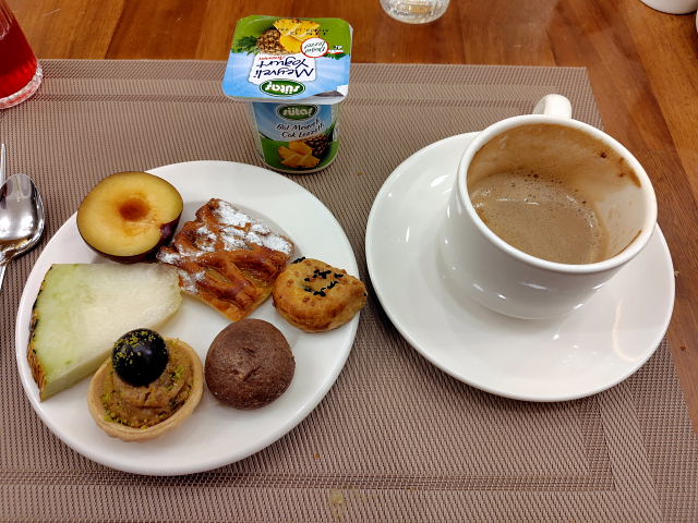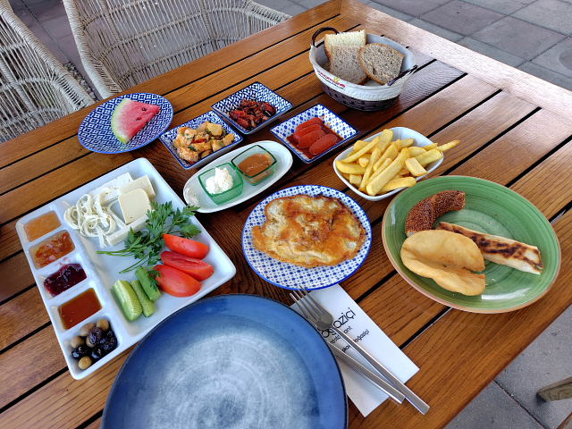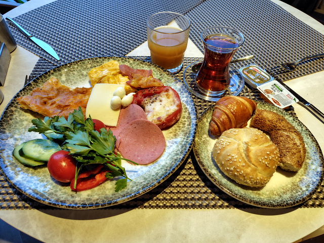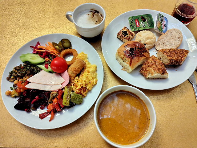 朝食は7時半からだが4時に起きてしまう。トルコの朝食は何処ともよく似ている。パンの種類だけはあるがご飯はない。メゼ(前菜)がたくさん並べられているだけなんかな。ここはカプチーノが飲めた。サラダ、玉子焼き、煮物少し、ジュース2種、チャイ。トルコでチャーハン、カレー、寿司は無理な話だ。こんなのばかり食べていると便の出も悪くなってくる。