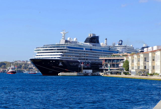 海が見えてきた方向に降りていくと海岸道路に出た。港に大型クルーズ船が停まっている。何処の船だろう。よく見るとすぐ後にもう1隻停まっている。目指すDolmabahçe Mosqueは補修中で入れない。時計塔はDolmabahçe Palace敷地内にあり入場料を払わないと入れないからパス。ここまで来るだけで疲れてきた。