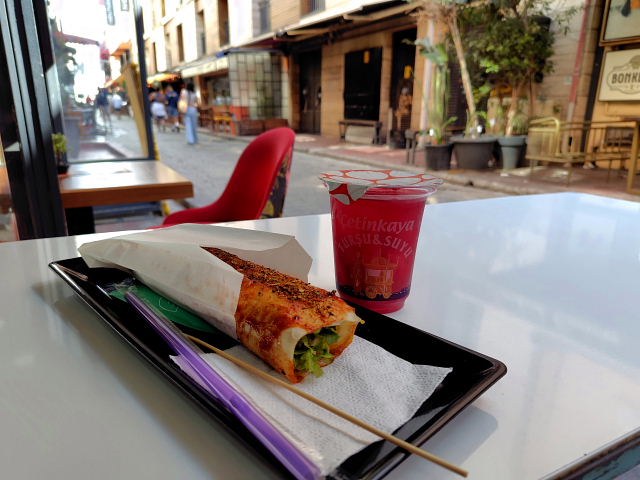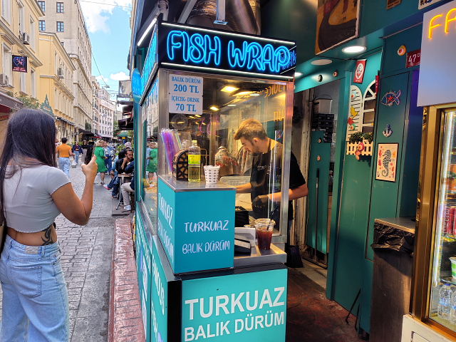 この辺りがフィッシュ・マーケットらしいんだが……そんな雰囲気がない。魚の臭いがしないんだ。一筋南の通に入るとバルク・エキメッキ(サバサンド)の屋台が出ていた。サンドじゃなく巻いて(クレープ)るのが200TL。イスタンブールではこれを食べねばと注文。赤いベリーみたいなジュースも一緒にしたんだが……これはジュースじゃなく梅干し汁みたいに酸っぱい(調べて見るとシャルガム・スユという紫ニンジンを発酵させたドリンクで定番とか)。サバサンドの味は絶品だった。