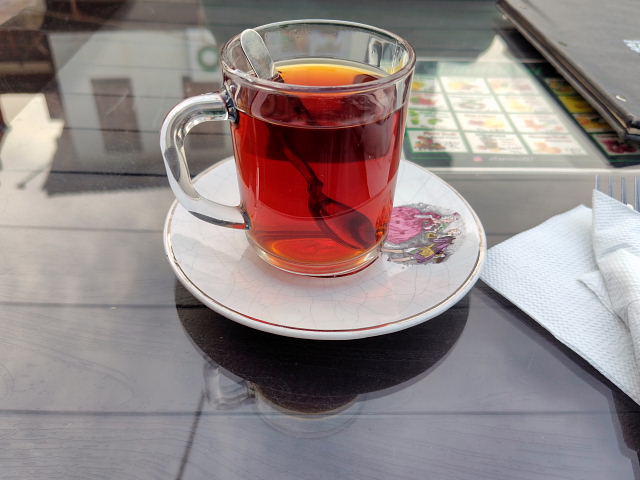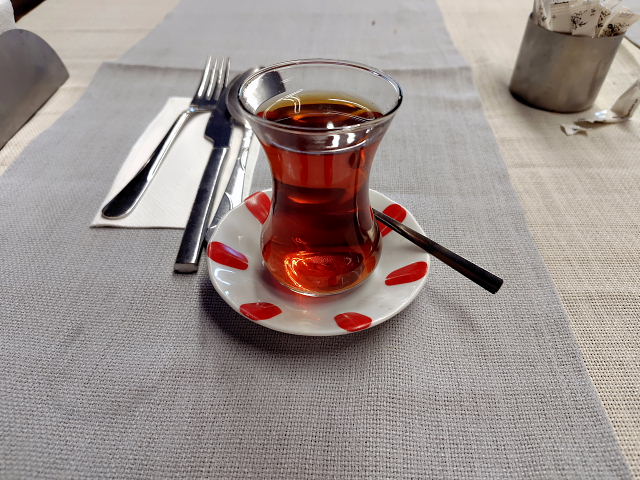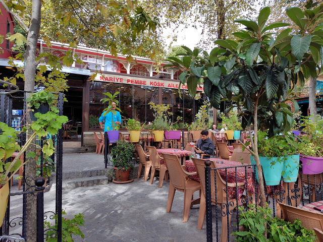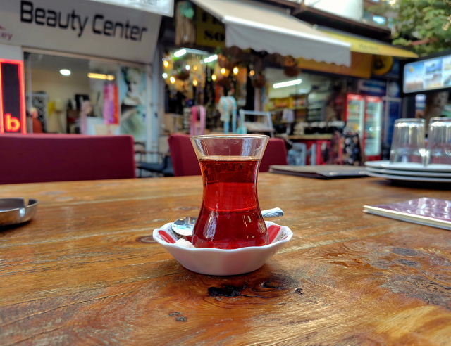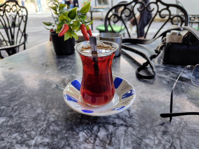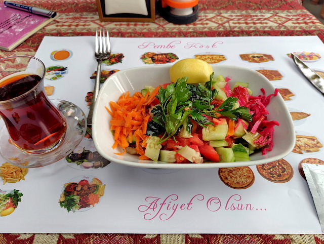 喉が渇いてきたのでモスク前のカフェ Kariye Pembe Köşk Aile Çay Bahçesi でチャイとサラダの軽食をとった(220TL)。味は普通だがロケーションが良い。イスタンブールは何処でも絵になる。コーヒーよりチャイが合う。
