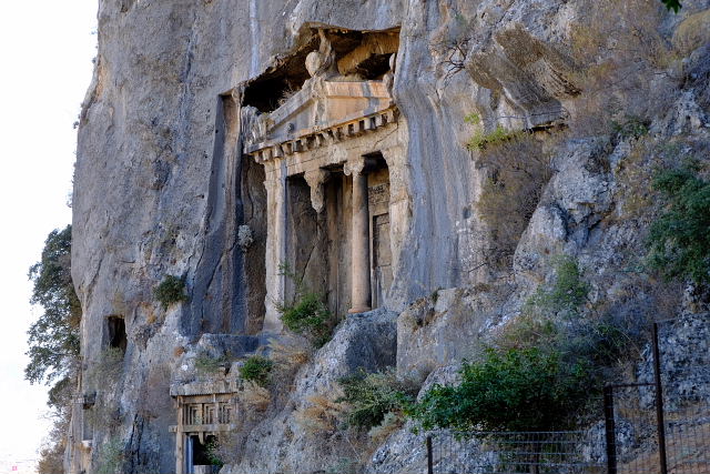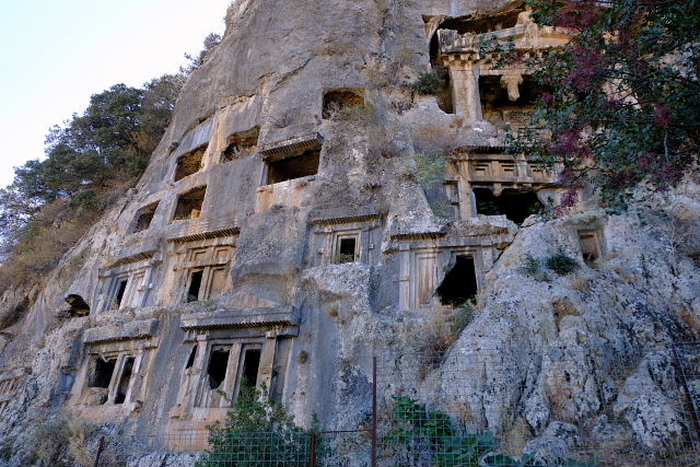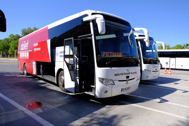 ダラマン行フライトは少し遅れて出発した。寝てしまって何時離陸したのか覚えてない。横の窓際席に赤ちゃん連れのトルコ人夫婦が乗っていた。約1時間のフライトでダラマン空港着10時50分。周りははげ山に囲まれタイみたいな緑の山とは全く雰囲気が異なる。空港の外に出るとバスが3台停まっていた。真ん中のがフェティと書かれていた。運チャンに聞くと、料金は中で。すぐに乗り込んだがまだ誰も乗っていなかった。今の時期は観光客も少ないのか、なんて思っていたらドンドン乗ってきた。飛行機の荷物受取で時間が掛かっていただけなんだ。