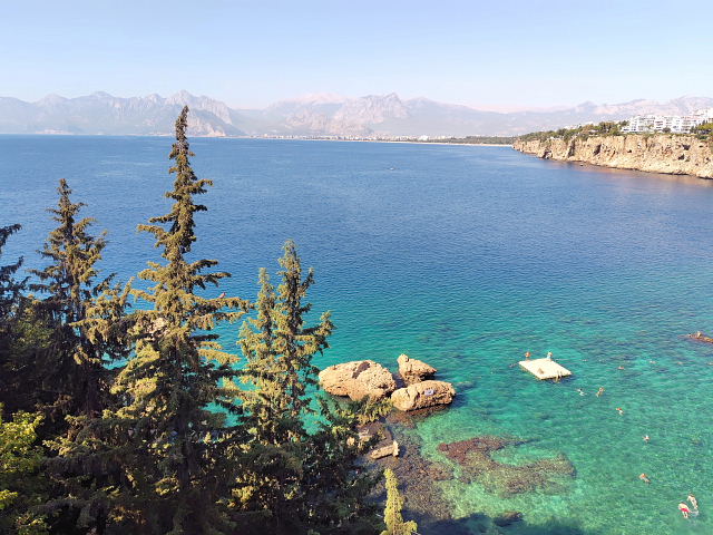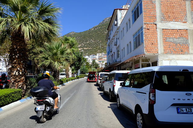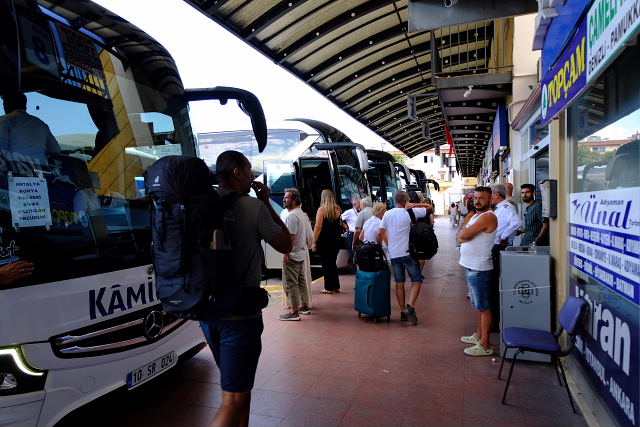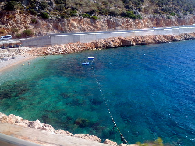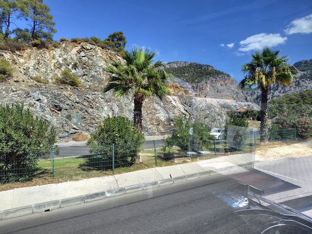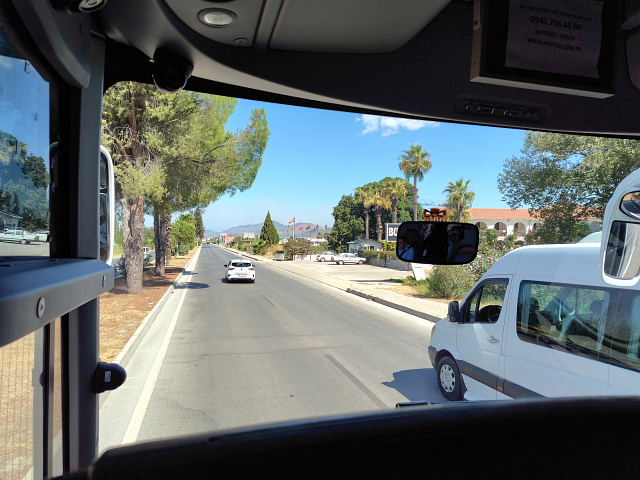 バス内は冷えるかもと長袖シャツ、中厚ズボンにしたがバスターミナルに行くだけで汗だく。地中海側がこれほど暑いとは思わんかった。バス会社のオフィス(机があるだけの)で9時30分発アンタルヤのチケットを言うと、バスの中で。バスは5分前くらいにやってきた。座席はフリー、乗ったのは半分ほど。高級バスじゃなく路線バスなんで席が狭い。料金はキャッシュ払い。ほぼ全員がキャッシュだった。海側の席にしたから眺めは良いんだが陽差しもきつい。