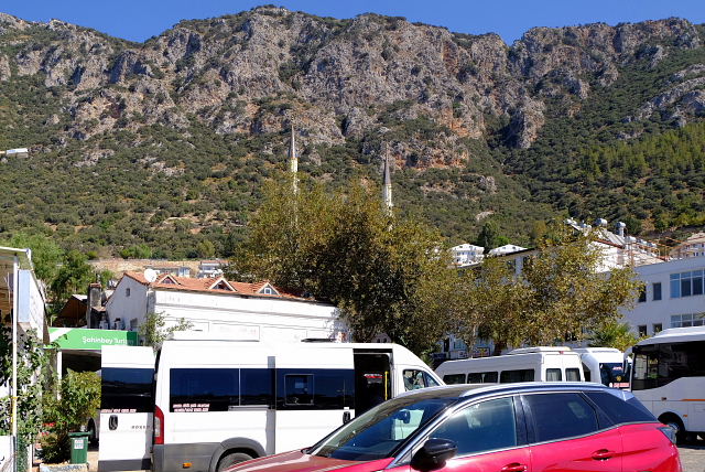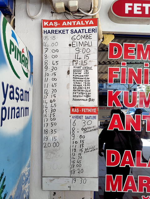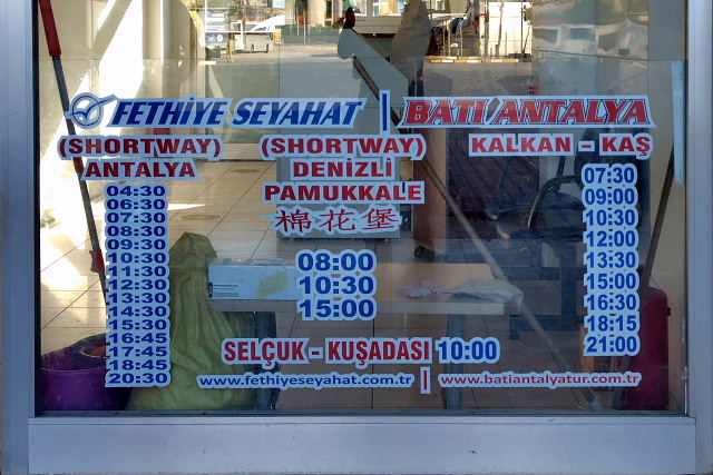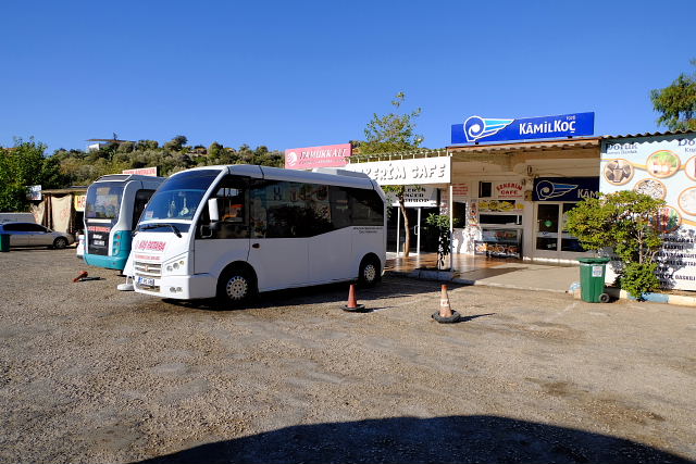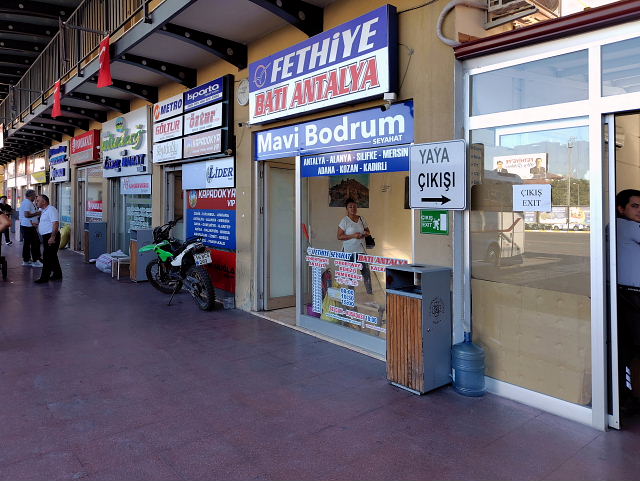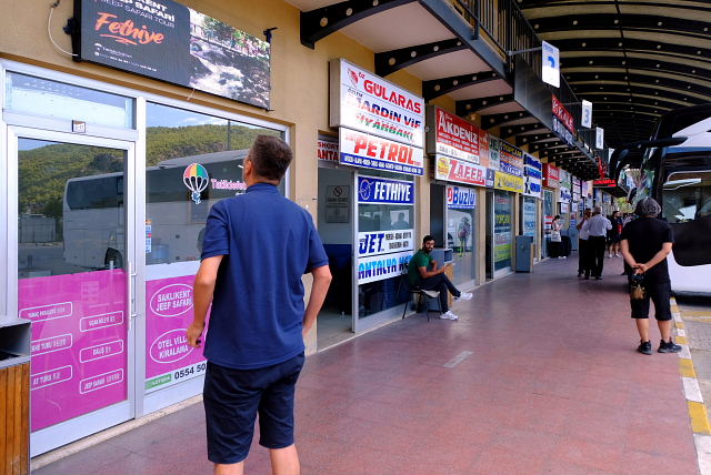 11時半バス出発。満席になっていた。海岸沿いの道を快速走行。どこにも寄らずフェティエまで直行、オトガルまで約1時間。大きな建物内じゃなく吹きさらし露天駐車場。オトガルというとイスタンブールなど大都会のバスターミナルを想像するけど、こんな簡易な所のほうが多いんだ。バス会社のオフィスがズラリと並んでいる。次のカシュ行きはどののになるんだろう。