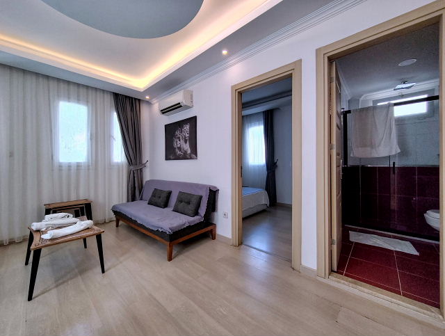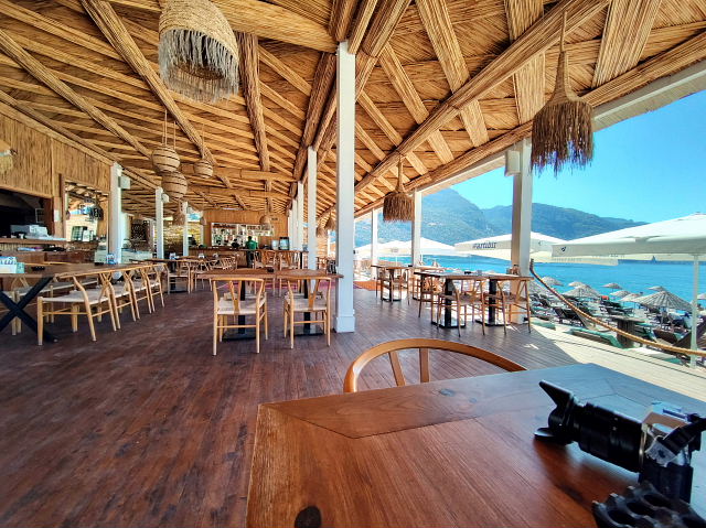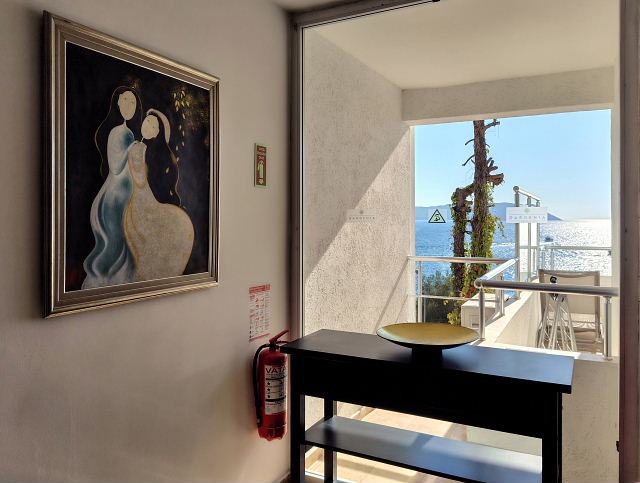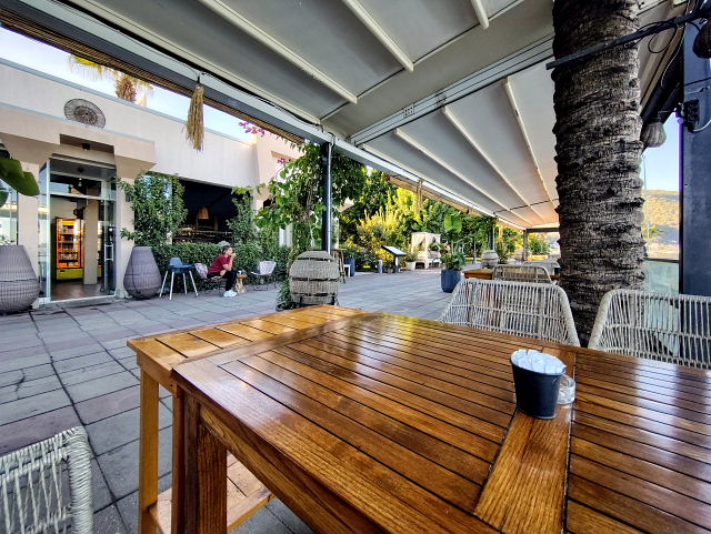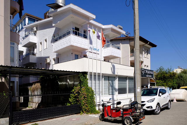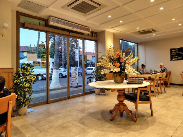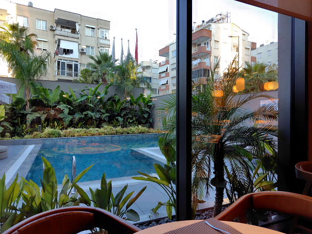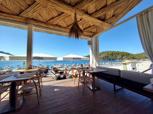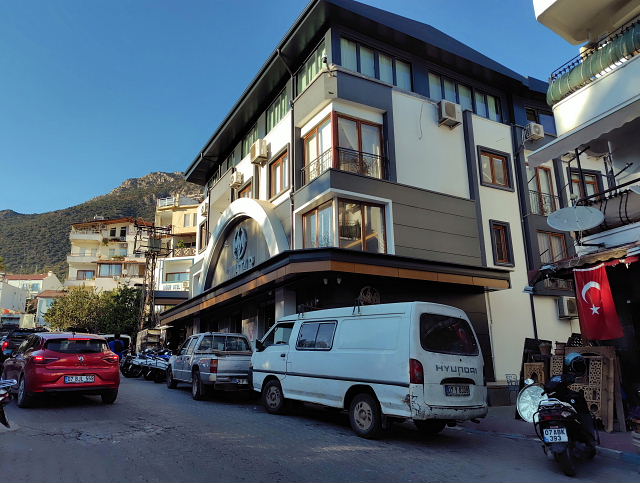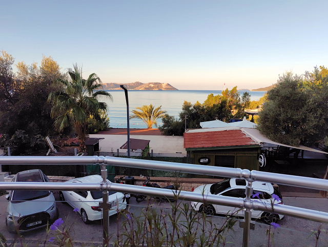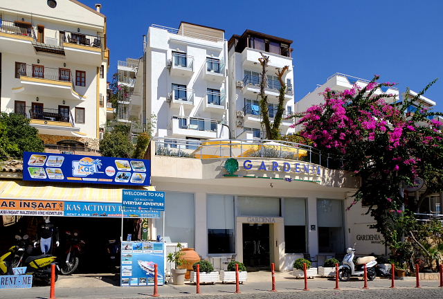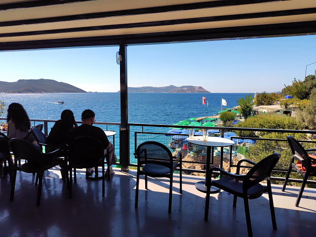 Gardenia Hotel(ガーデニア・ホテル)のチェック・インは2時から。時間調整をと手前の Spoon Coffee でアイス・ラテ(180TL)。海際高台のカフェ、真下の浜にビーチパラソルが並んでるが遠浅じゃなく深そう。一昨日のオルデニズほどの天国的雰囲気はない。