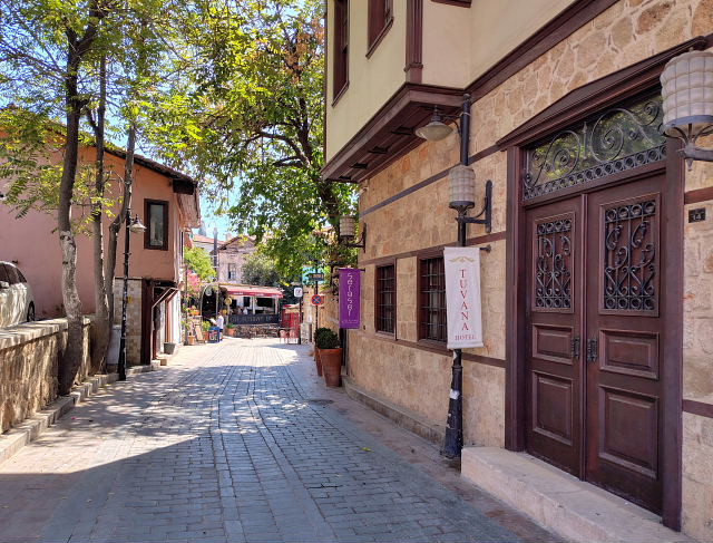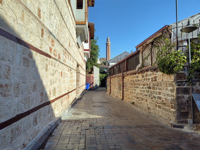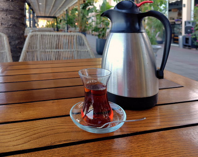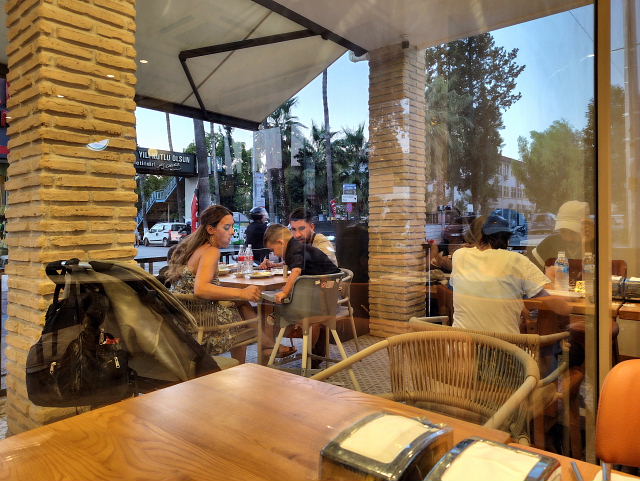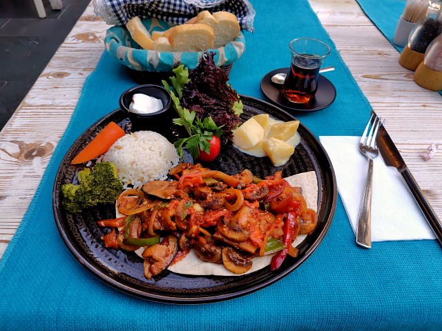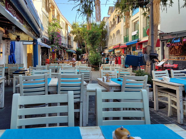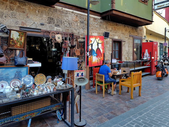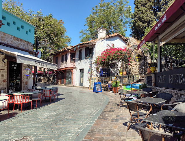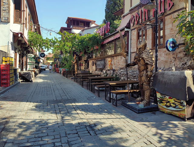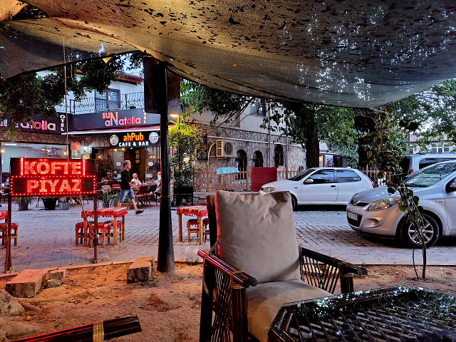 早めの夕食はヴィーガン・レストランでと4時に外に出たがこの時間帯は陽差しがきつい。フェティエ以上の暑さだ、カラッとした熱帯と言うべきか。アンタルヤもこんな具合なんかな。もっと寒いかもと中厚長袖シャツを持ってきたのに出番がない。この街も観光客向けで狭い道の両側にいろんなグッヅの店が並んでいる。女性がやけに多い、タイと大違いだ。ヴィーガン・レストランは止めてオールドタウンの中にある Cafe Corner Restaurant でヴェジタリアン・プレートとチャイ、480TL。食べ物とチャイを一緒に注文するとチャイの値段は請求されないみたい。これは店に寄ってマチマチだが。ベジ・ドルネとかいうのだったが肉系ばかりだったので偶にはこんなのも食べたかった。しかしよくまあレストランばかり集まって潰れないもんだ。味は取り立てて言うほどじゃないけどオープン席で食べる気分は捨てがたい。今回のトルコ旅行、食べ物に関しては味はともかく雰囲気が良い所ばかりだ。