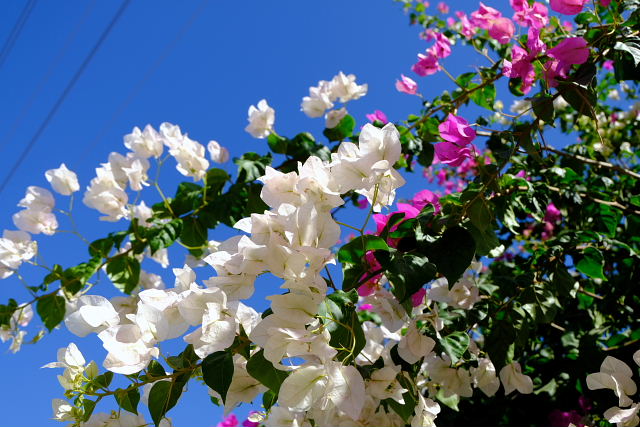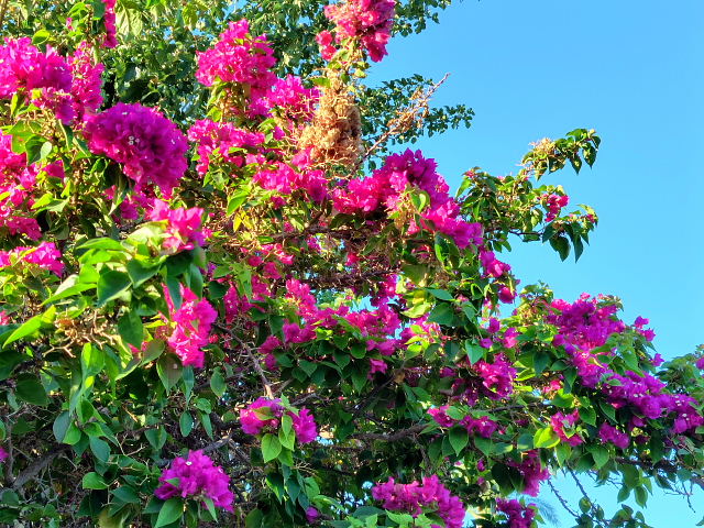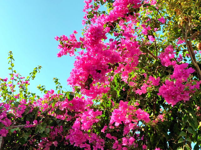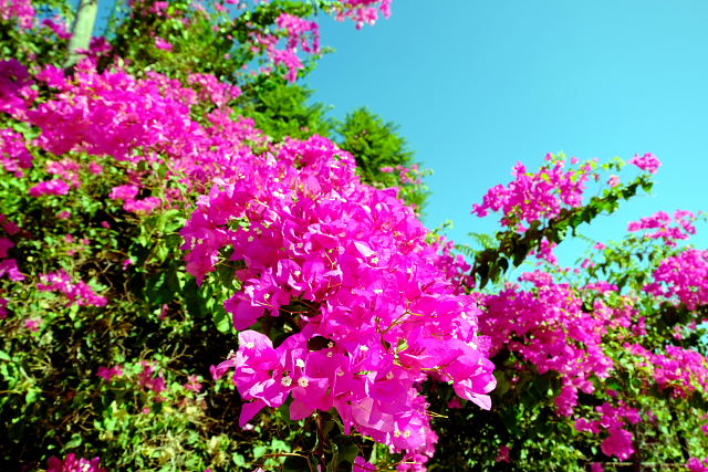 降りるのは来た道に出て車道を下るしかないようだ。色とりどりのブーゲンビリアが咲き乱れ熱帯の国を歩いてる気分だが湿気がない。景色が良く車道の所々に休憩(展望)所が設けられていた。真下に劇場が見える辺りで下に下る鉄梯子を降りると劇場の丁度上に出たがやはり今日も閉まっているみたい。回縁を回って下まで行ったがフェンスには鍵が掛かっていた。補修している風じゃなかったが何故だろう。整備してもこの大きさなら金を取るには難しい。期待していた古代劇場の1番目は外れ。