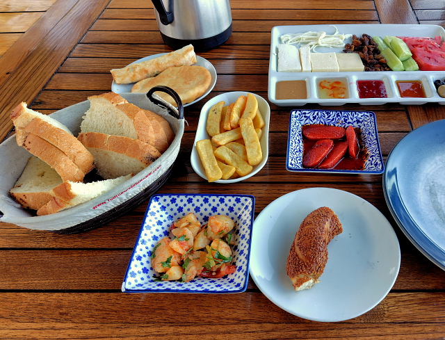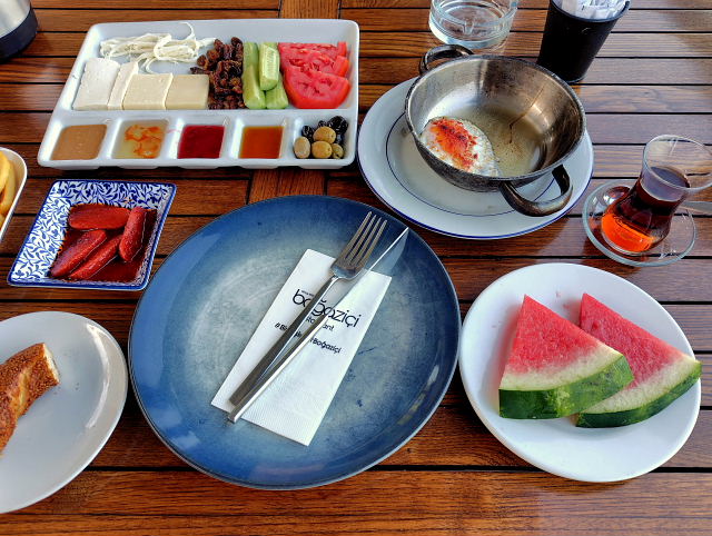 ホテル提携のレストランは Boğaziçi Restaurant、ネット評価では二分している。食べ物なんて好き嫌いがあるんだから万人向けてなことはマズない。この通にはこんな感じのレストランが並んでいる。この景色を見ながら食べるんだから味がどうのとモンクはないはずだ。時間丁度になりレストランに行くと犬達が寝転びノンビリムード、猫よりも犬のほうが落ちついて見える。ドリンクは聞くから“カプチーノ”と言うと“それは別料金になる”とのことでチャイにした。タイとは違うんだ。さて運ばれてきた料理はメゼ、目玉焼き、イモ料理、キョフテみたいなのが4個、パンも色々。これでスープがあったら言うことナシなんだが。毎朝同じなんかな明日はオムレツにしよう。お客は一人だけ、もう一グループもいたがチャイを飲んでいた。味はともかく腹は張るし、景色が抜群。毎日こんな所で食べられるんだったら他はどうでもイイ。パンばかり食べていても出る物はちゃんと出ている。