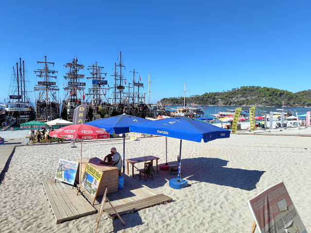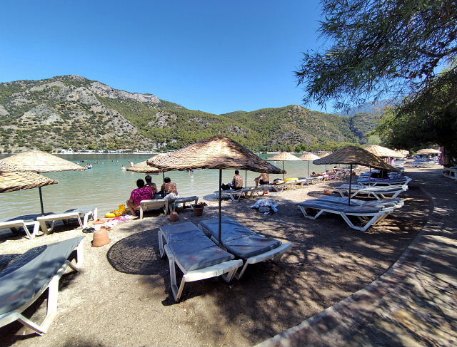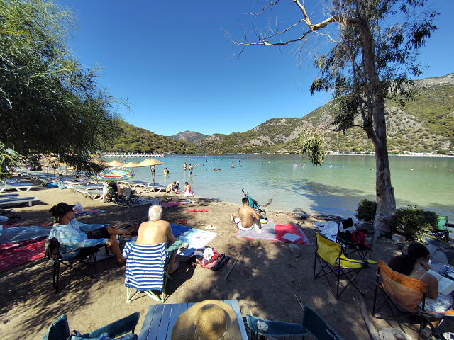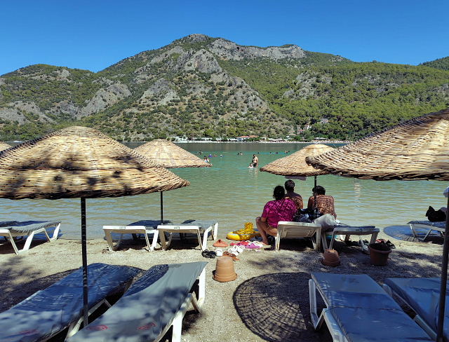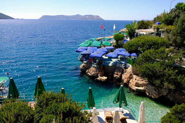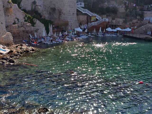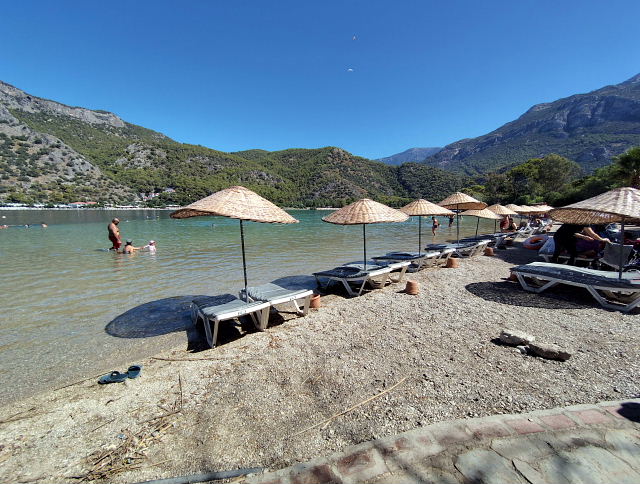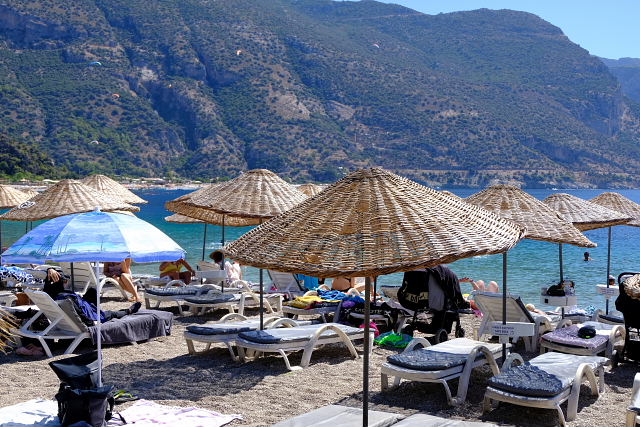 ビーチはすぐに深くなってるみたいで子供達の姿がない。砂浜の先まで行くと入り江側にパラソルが並んでいた。こちらは浅瀬のようで家族連れが多くいた。世界で一番美しいビーチにノミネートされただけのことはある景色。妻はもっと泥(人)臭いランカウイやボルネオみたいな景色のほうが合ってるように思えてきた。トルコも地中海側は本当に暑い。