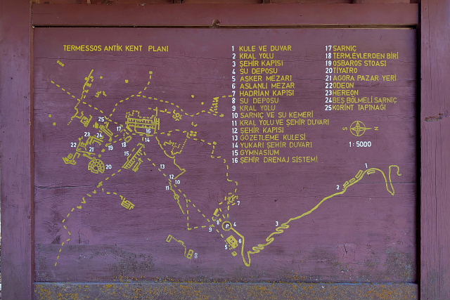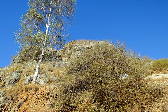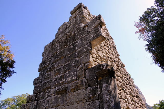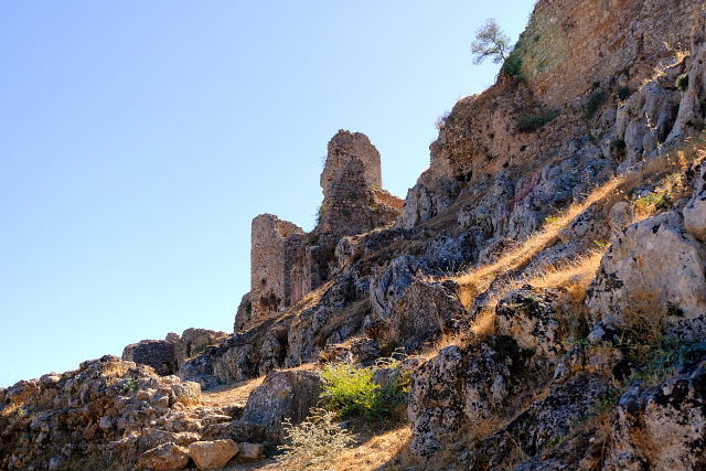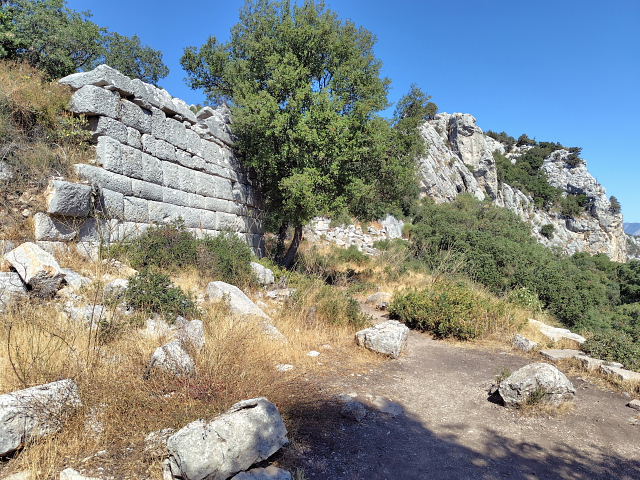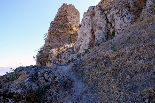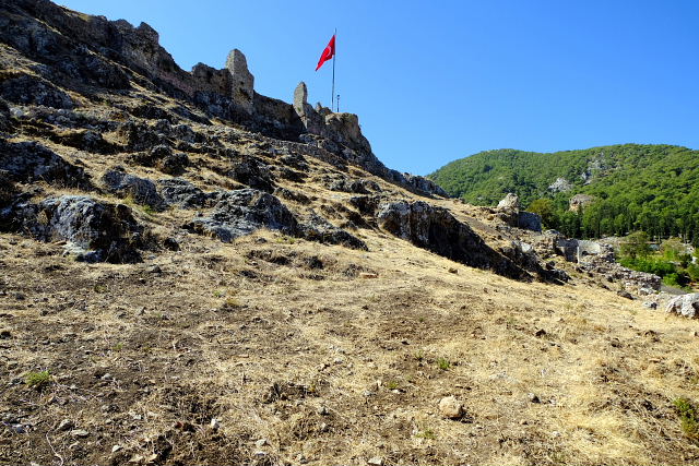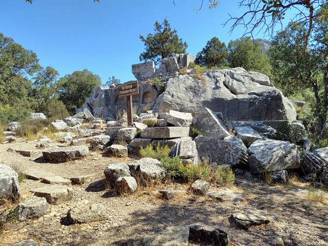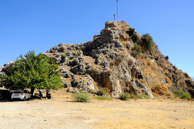 下の入口で入場料(150TL)を支払う。ネットの古い?!情報では20TLとなっていた。遺跡でも要るのかな。一月の内に何回か値段が変わるような国だから書いた時点でもう古くなってしまう。この値段も何時まで持つのか。ここまでは熱風が吹いていたけど山に入ると段々冷えてきた。駐車場着10時頃。売店でもあるかと思っていたがナンもナイ。遺跡案内板が立っている横に登山道が上に登っていた。こちらはウォーキングシューズを履いてるからノープロブレムだが、普通の観光客の靴じゃシンドイだろう。駐車場にも車は少ない。ガイドブックにも書いてないのは分かる。歩く体力がなかったら行き着けない遺跡なんだ。